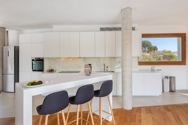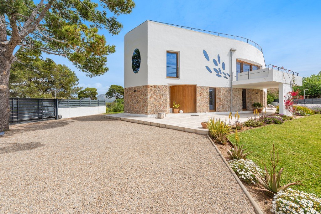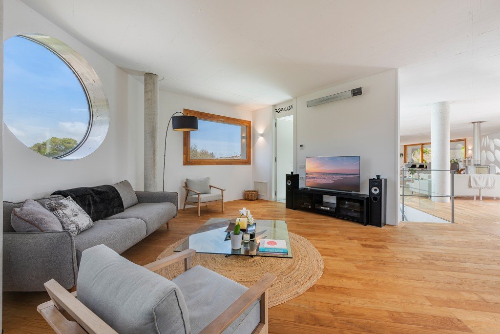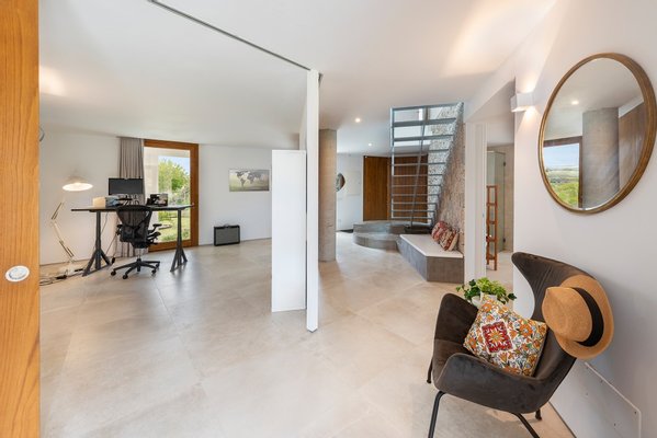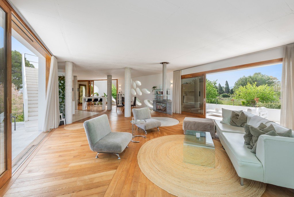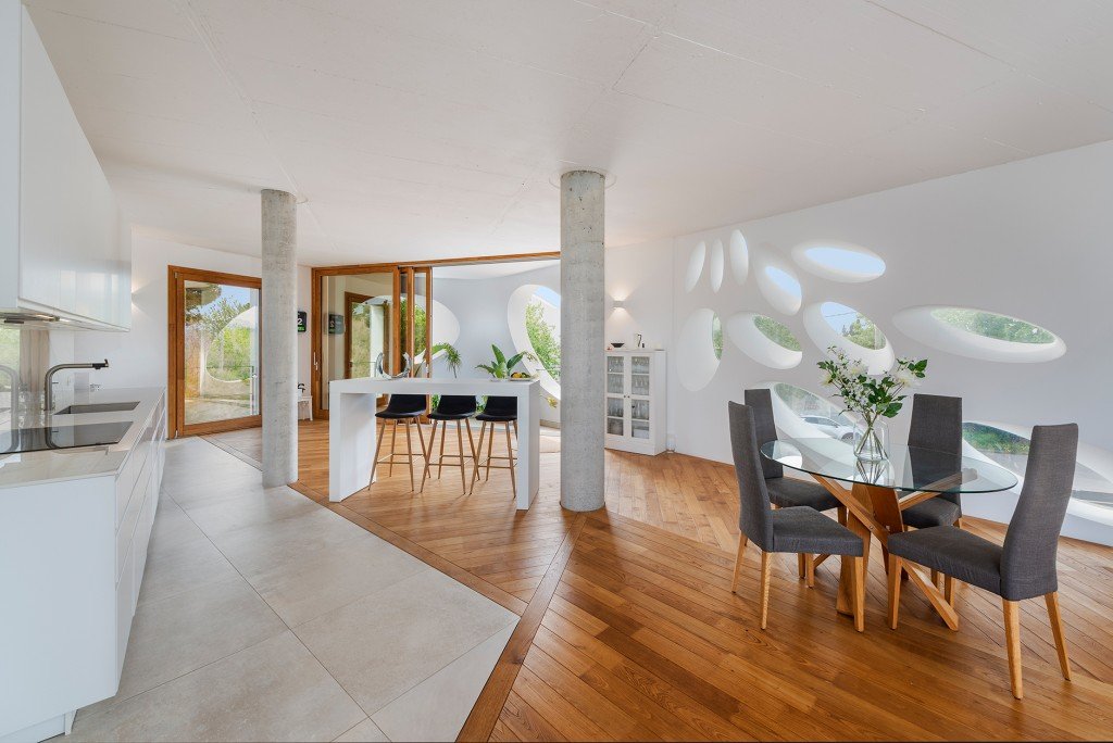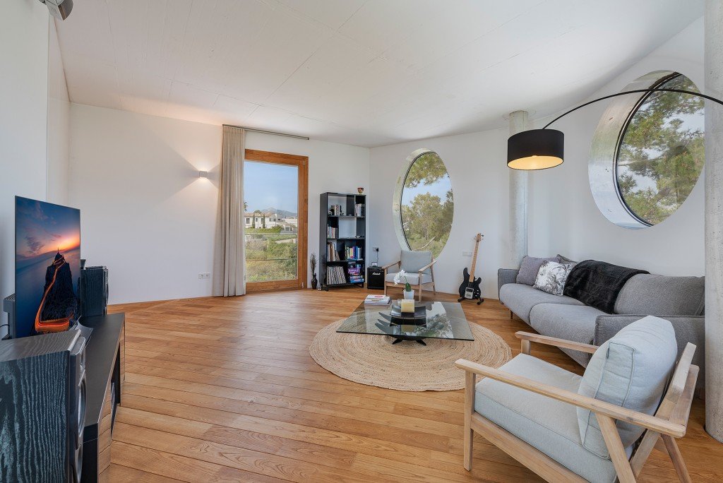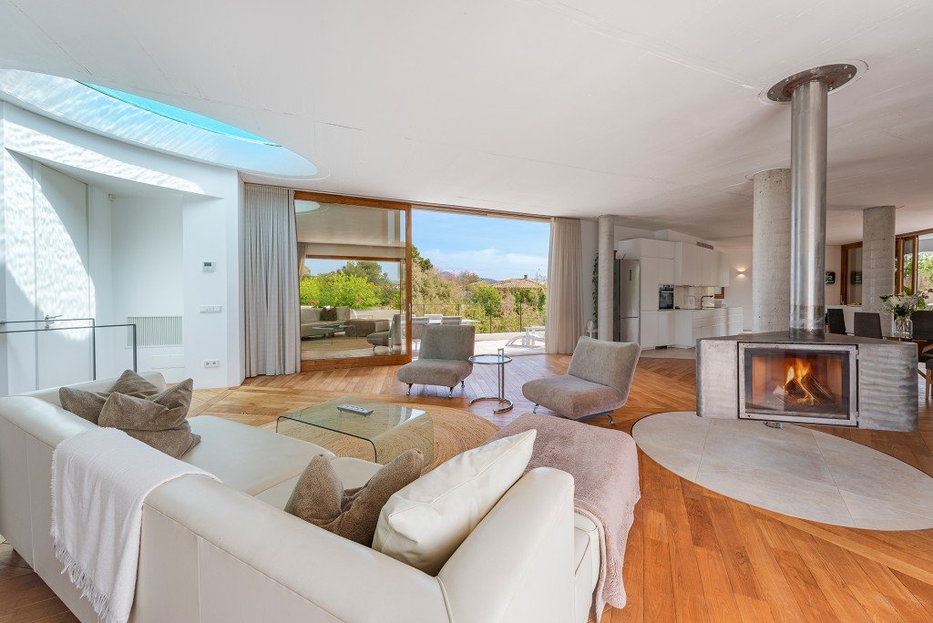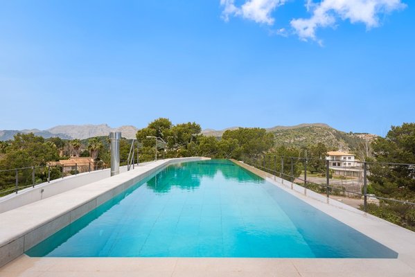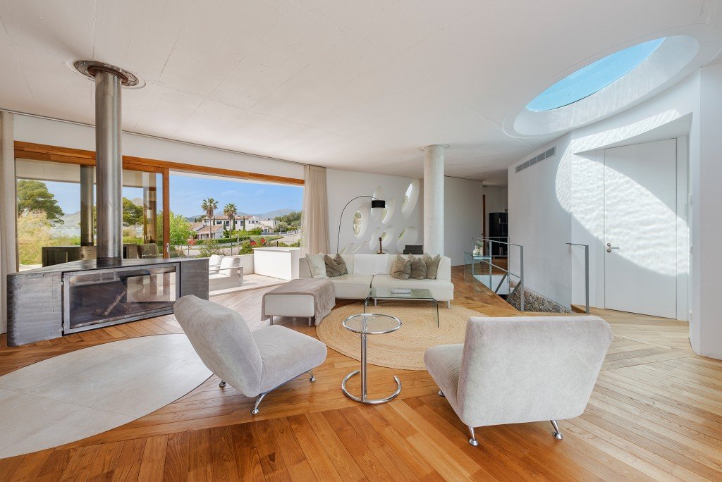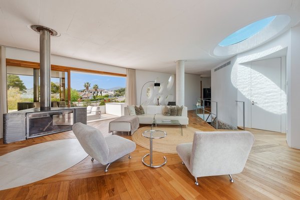 Das spektakuläre Design der Villa wurde von einem renommierten Team preisgekrönter Architekten entworfen und verfügt über ein 25 Meter langes, geschwungenes Dach und einen atemberaubenden Infinity-Pool mit Blick auf die Bucht von Pollensa und die Serra de Tramuntana. Ein charakteristisches ovales Fenster bietet von der Treppe aus einen Blick in den Pool und wirft plätschernde Reflexionen in den offenen Wohnbereich darunter, eine unvergessliche architektonische Note.