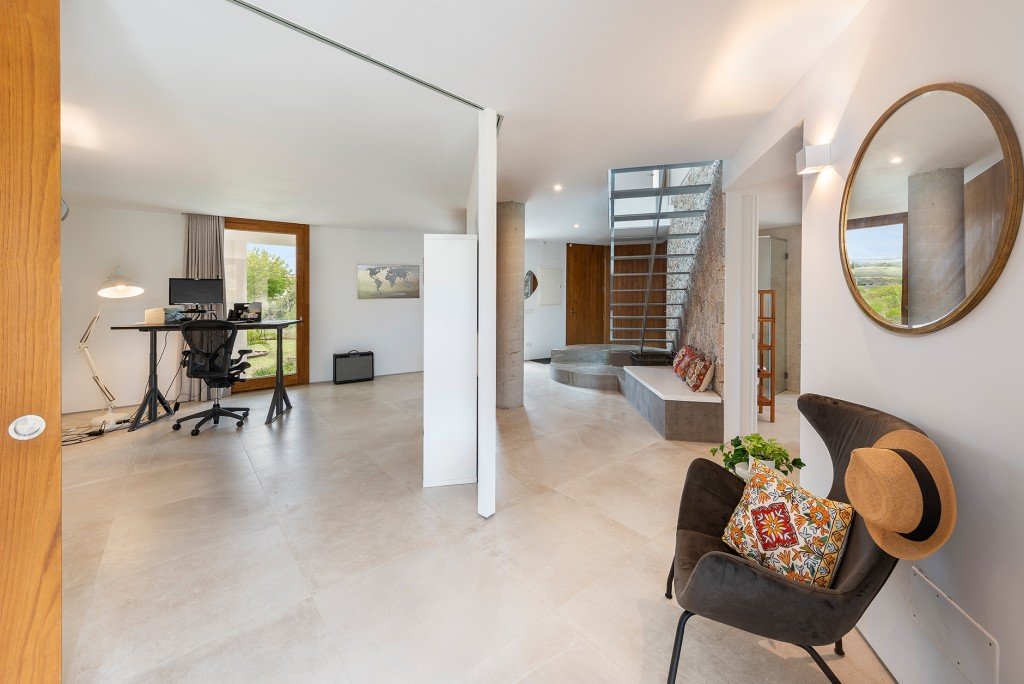 Der Hauptwohnbereich befindet sich im ersten Stock, um die Aussicht zu maximieren, und ist ein Paradebeispiel für modernes Design. Er verfügt über einen maßgefertigten schwebenden Kamin, maßgefertigte Holzböden und skulpturale Fenster, die die umliegende Landschaft einrahmen. Eine Drehtür ermöglicht es, den Raum weiter zu öffnen und nahtlos mit dem Außenbereich zu verschmelzen.
