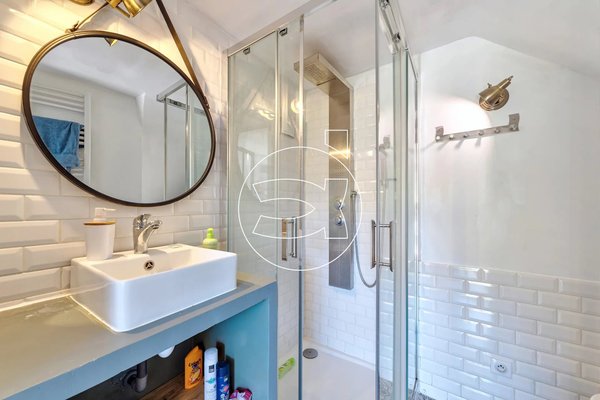Im Erdgeschoss verfügt die 40 m² große Zweizimmerwohnung mit separatem Zugang vom Parkplatz aus über ein separates Wohnzimmer, das in ein Schlafzimmer umgewandelt werden kann, wenn das Haus zusammengelegt wird, eine Küchenzeile, ein Schlafzimmer mit Ankleidezimmer, ein Duschbad/WC und eine Terrasse.