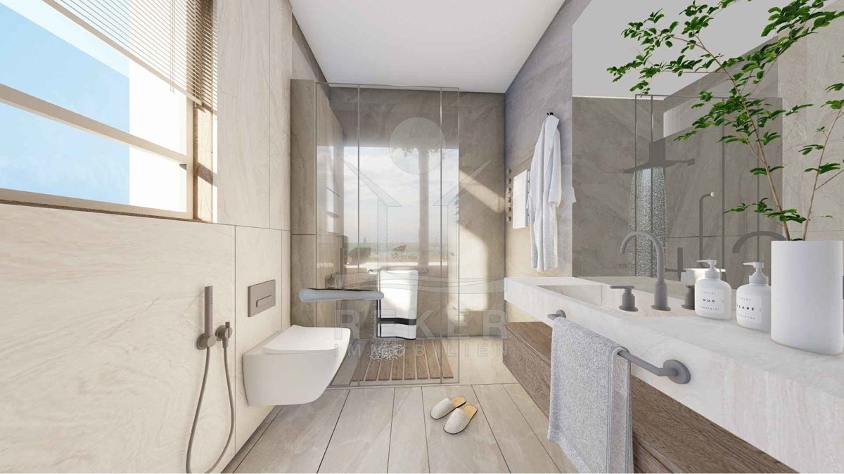 Nur 250 m vom Wasser: Diese stilvolle Doppelhaushälfte bietet Pool, Garten und Meerblick. Der Grundriss überzeugt, die Lage ohnehin. Und bei Ausstattung und Finish dürfen Sie mitentscheiden.