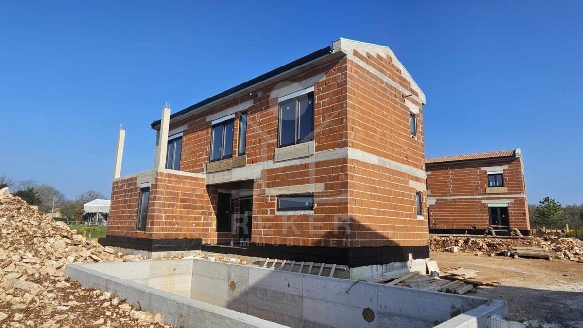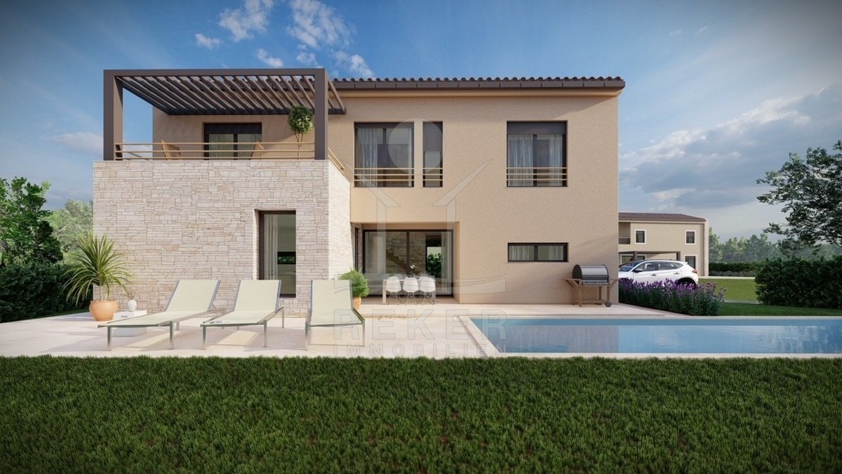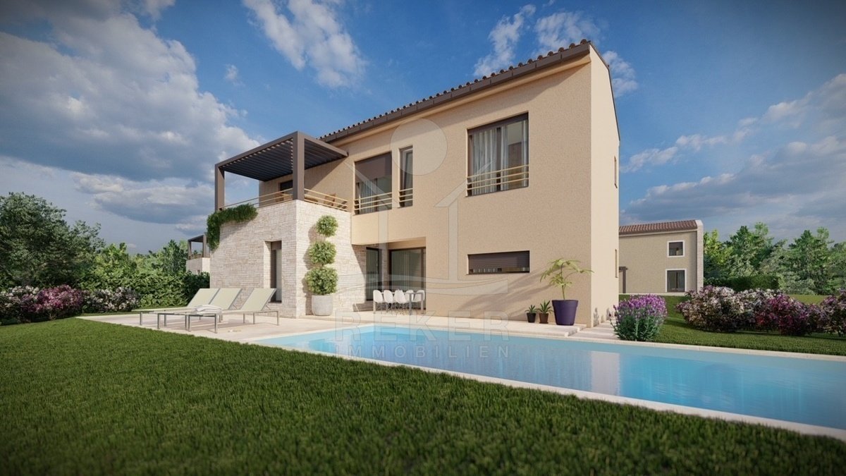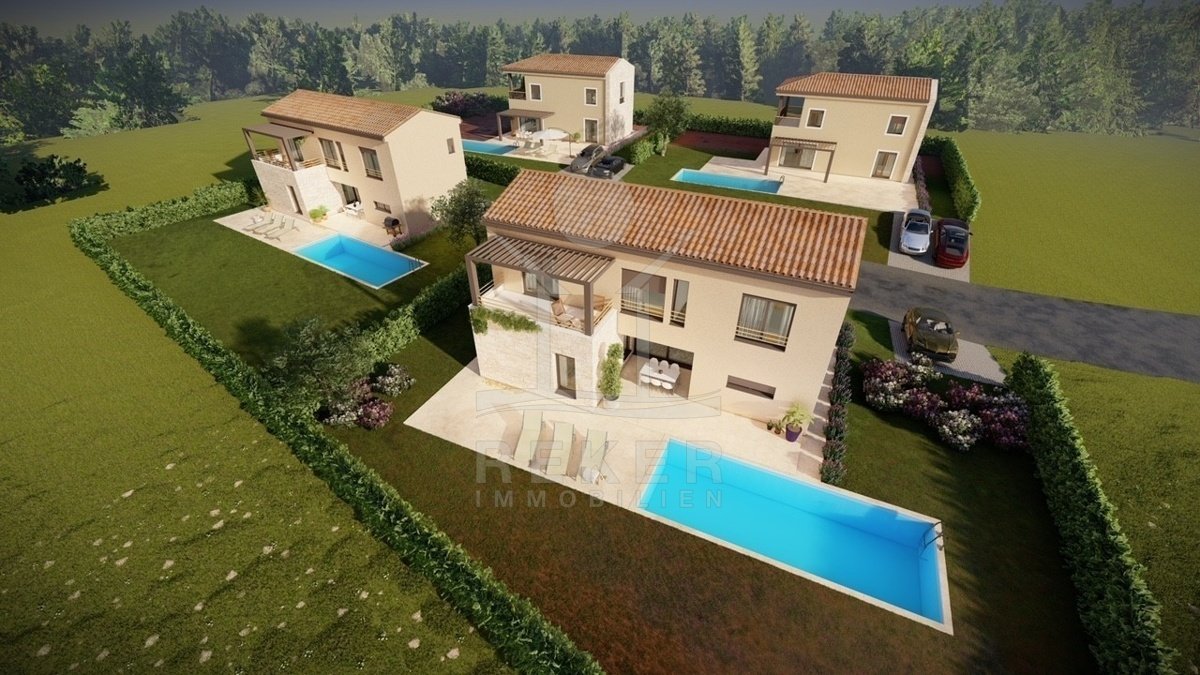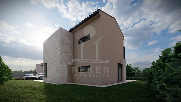 Ruhig wohnen, grün drumherum und trotzdem nicht abgeschieden – diese Villa entsteht im Ortsteil Baderna bei Poreč. Ein Platz am Rand des Waldes, mit Meerblick in der Ferne.