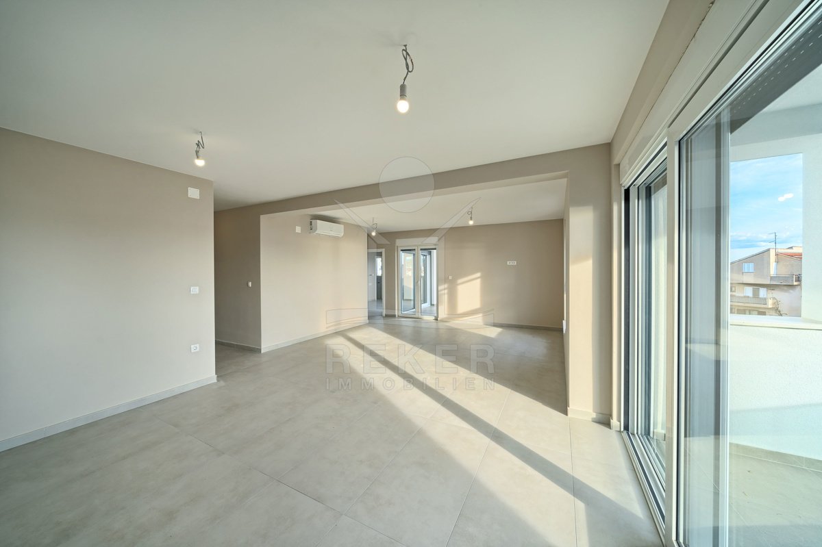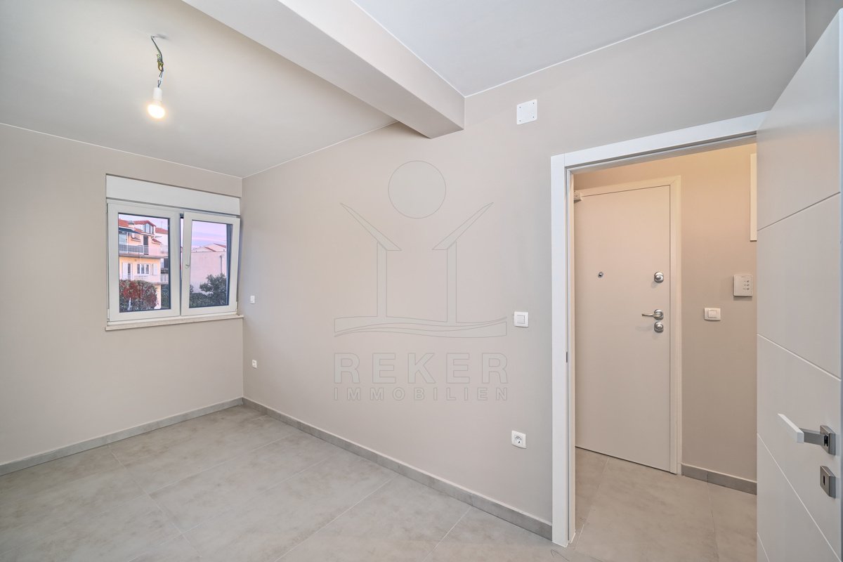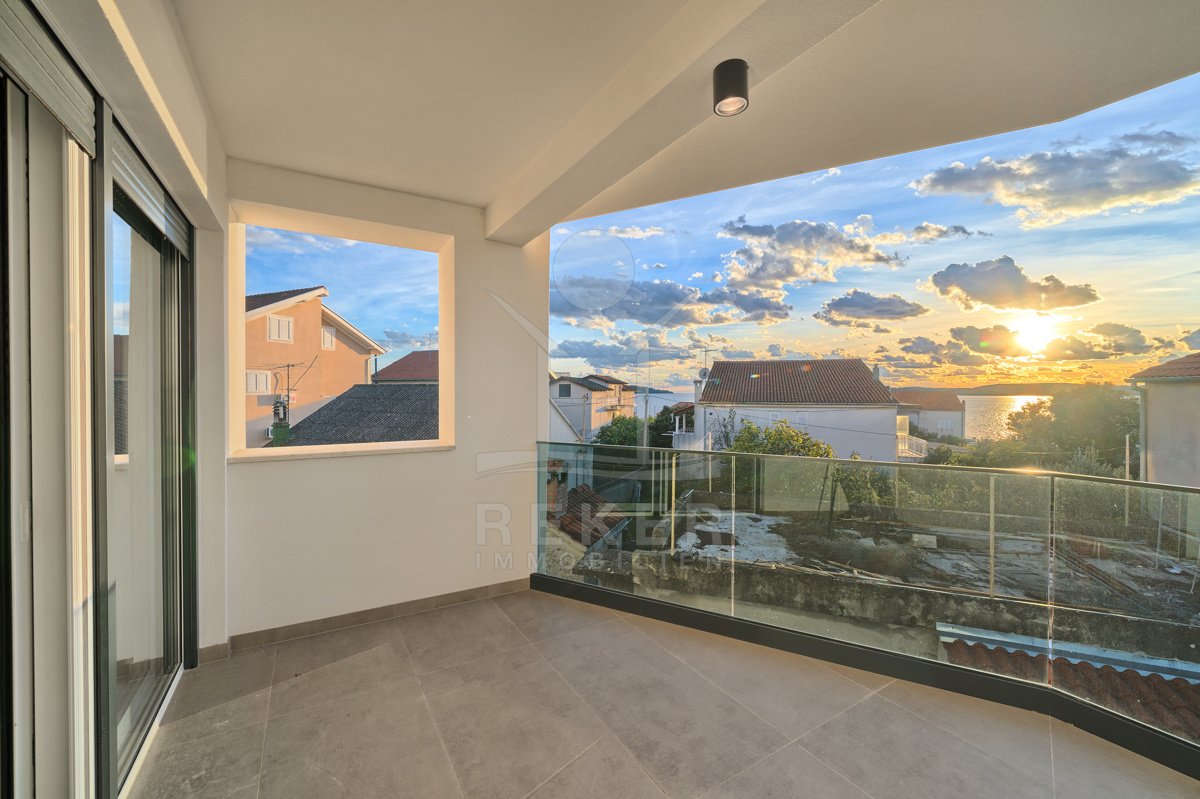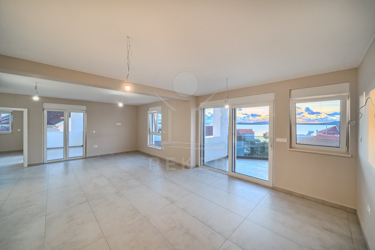 Brodarica. Ruhig, sonnig, und nur 150 Meter vom Strand entfernt. Die Wohnung liegt im zweiten Stock eines modernen Wohngebäudes. Zwei feste Stellplätze sind inklusive. Einfach parken und hoch ins Penthouse. Das Gebäude ist neu, die Wohnung sofort