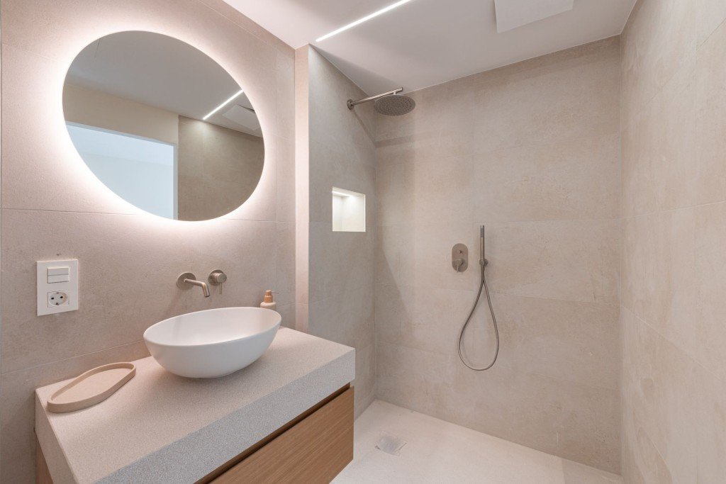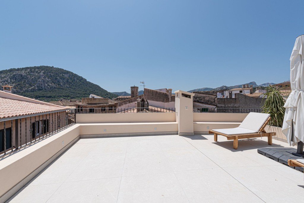 Die Dachterrasse mit Außendusche ist der perfekte Ort zum Entspannen, während Sie den Panoramablick auf die Berge, den Puig de Maria und die bezaubernde Landschaft genießen.