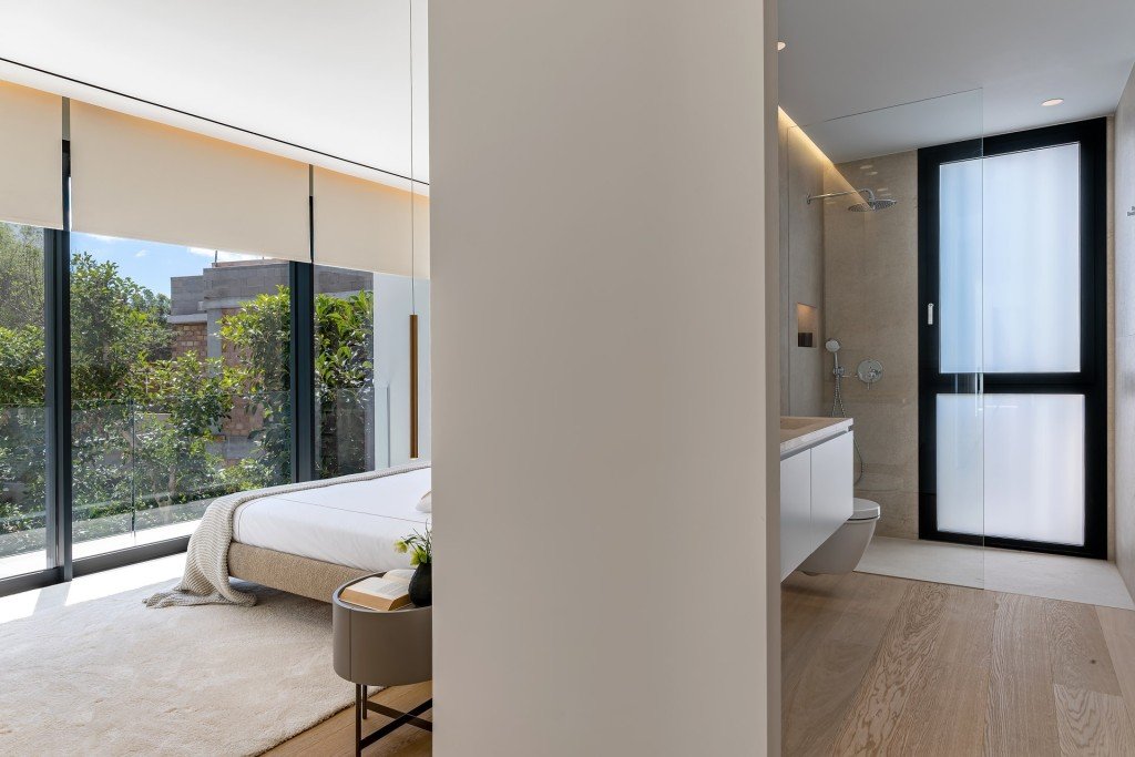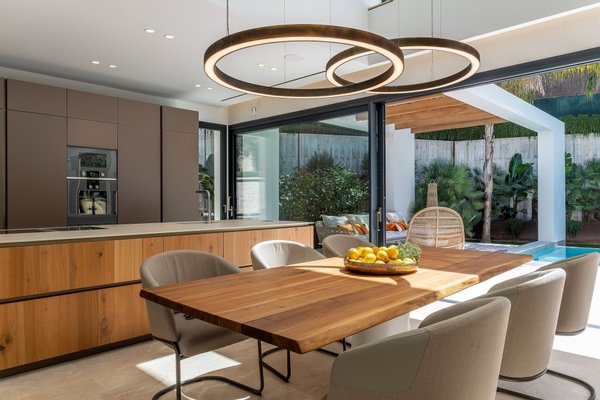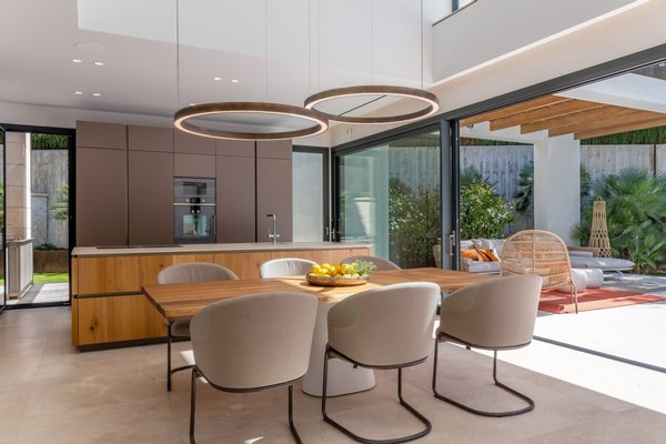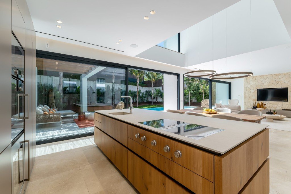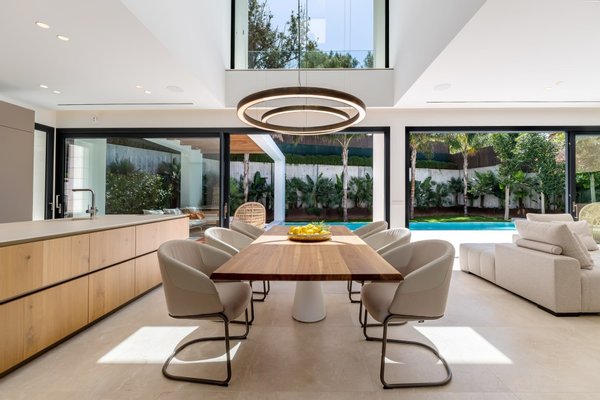 Beim Betreten der Villa werden Sie ein fabelhaftes, offenes Konzept vorfinden, das mit natürlichem Licht gefüllt ist und viel Platz und totalen Komfort bietet. Es gibt eine moderne Küche mit einer Insel und integrierten Gaggenau-Geräten, einen Essbereich und einen einladenden Wohnbereich, die alle von bodentiefen Fenstern profitieren, die Zugang zur geräumigen Terrasse bieten.