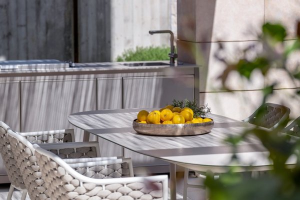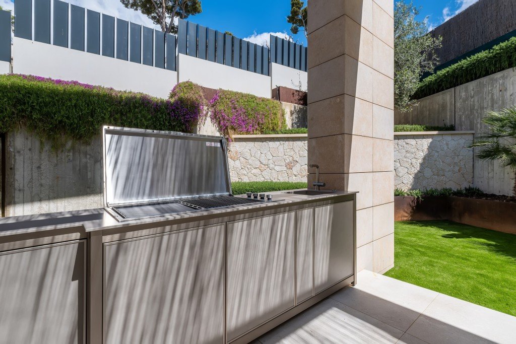 Draußen gibt es pflegeleichte Gärten, verschiedene Terrassen zum Entspannen im Schatten oder zum Sonnenbaden am Salzwasserpool , und es gibt einen Essbereich im Freien mit einer Sommerküche, wo man Gäste bewirten kann.