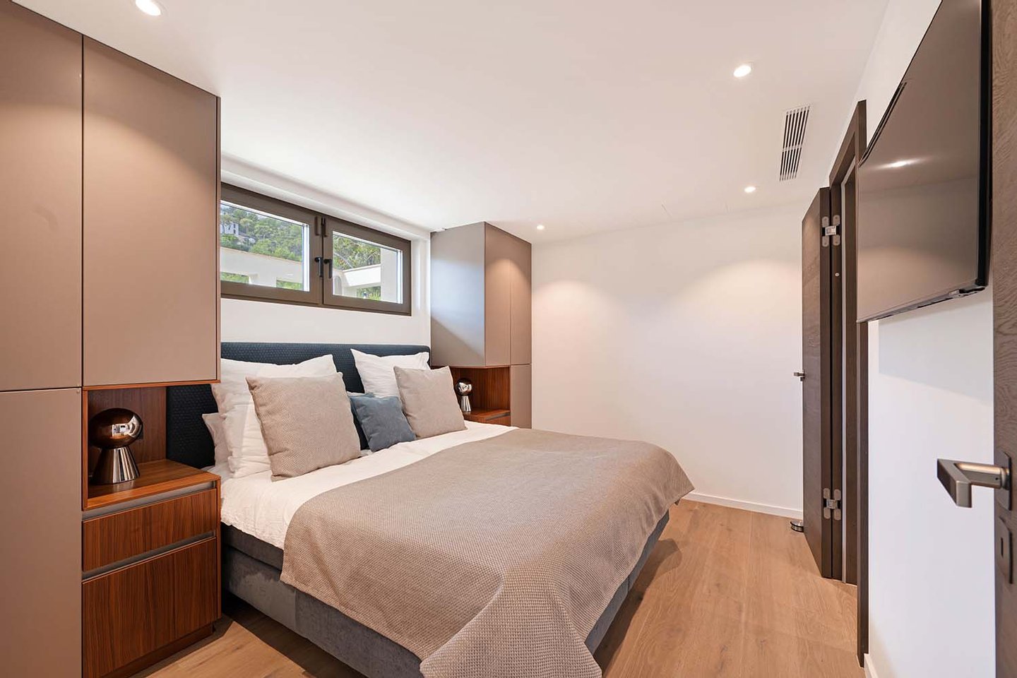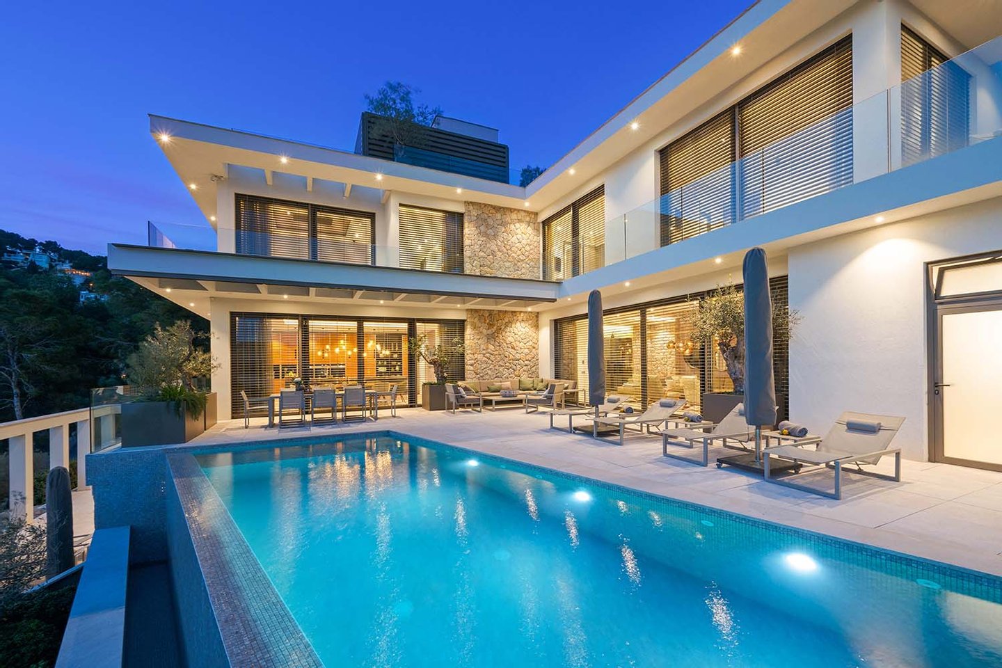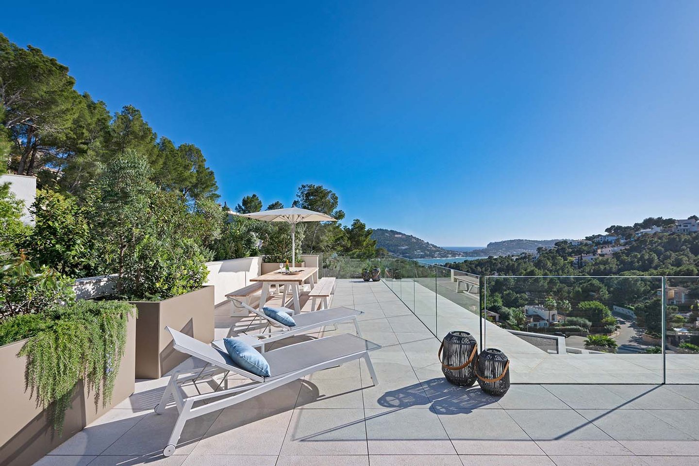 Modernste Technik und höchste Baustandards bis ins kleinste Detail setzen Maßstäbe der Superlative bei dieser einzigartigen Immobilie. Komfortabel erreicht man mit einem Aufzug alle Ebenen des Hauses, von der Garage bis zur großzügigen Dachterrasse und man genießt einen sehr schönen Blick auf den Hafen von Port Andratx und das offene Meer.