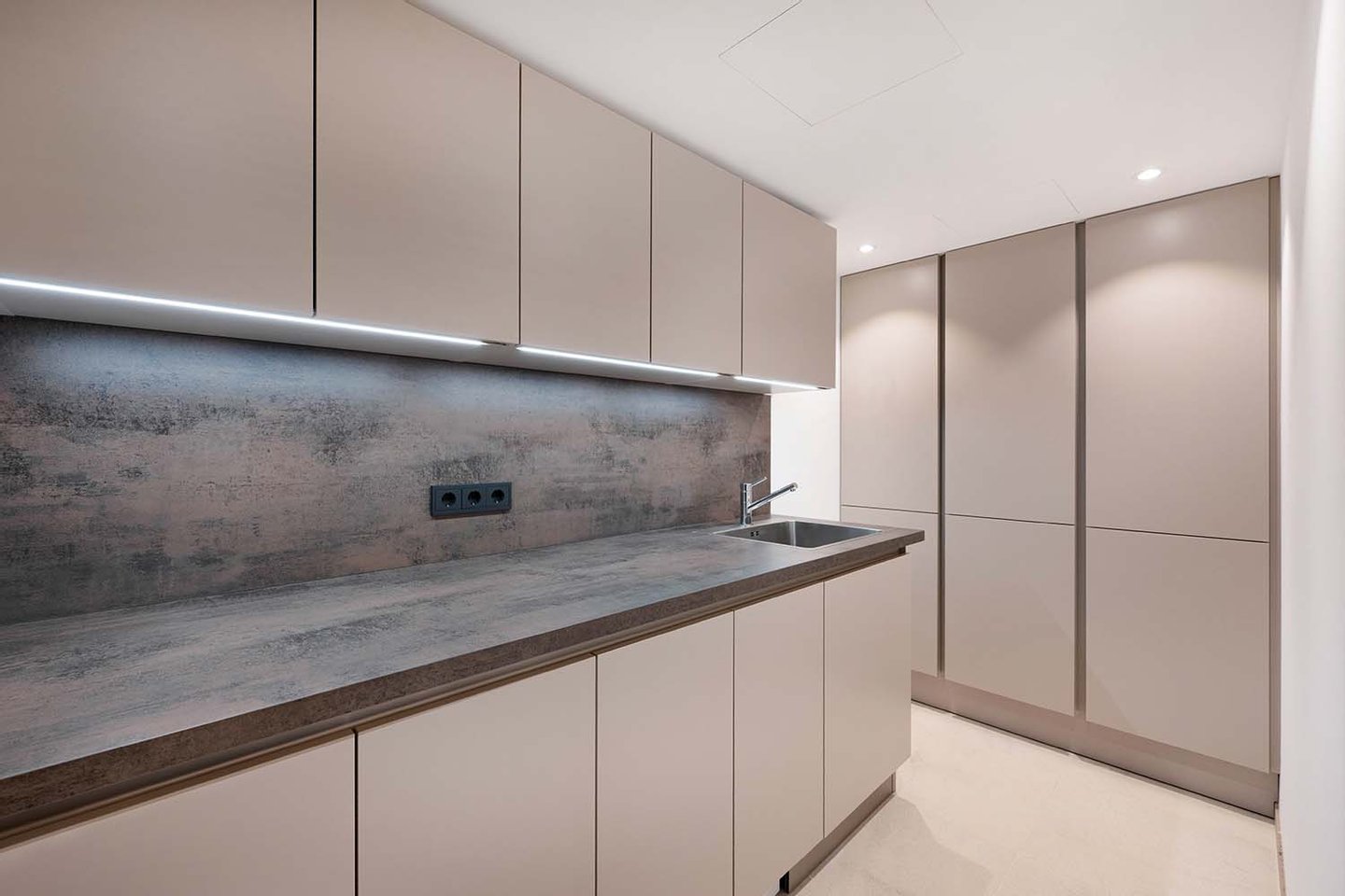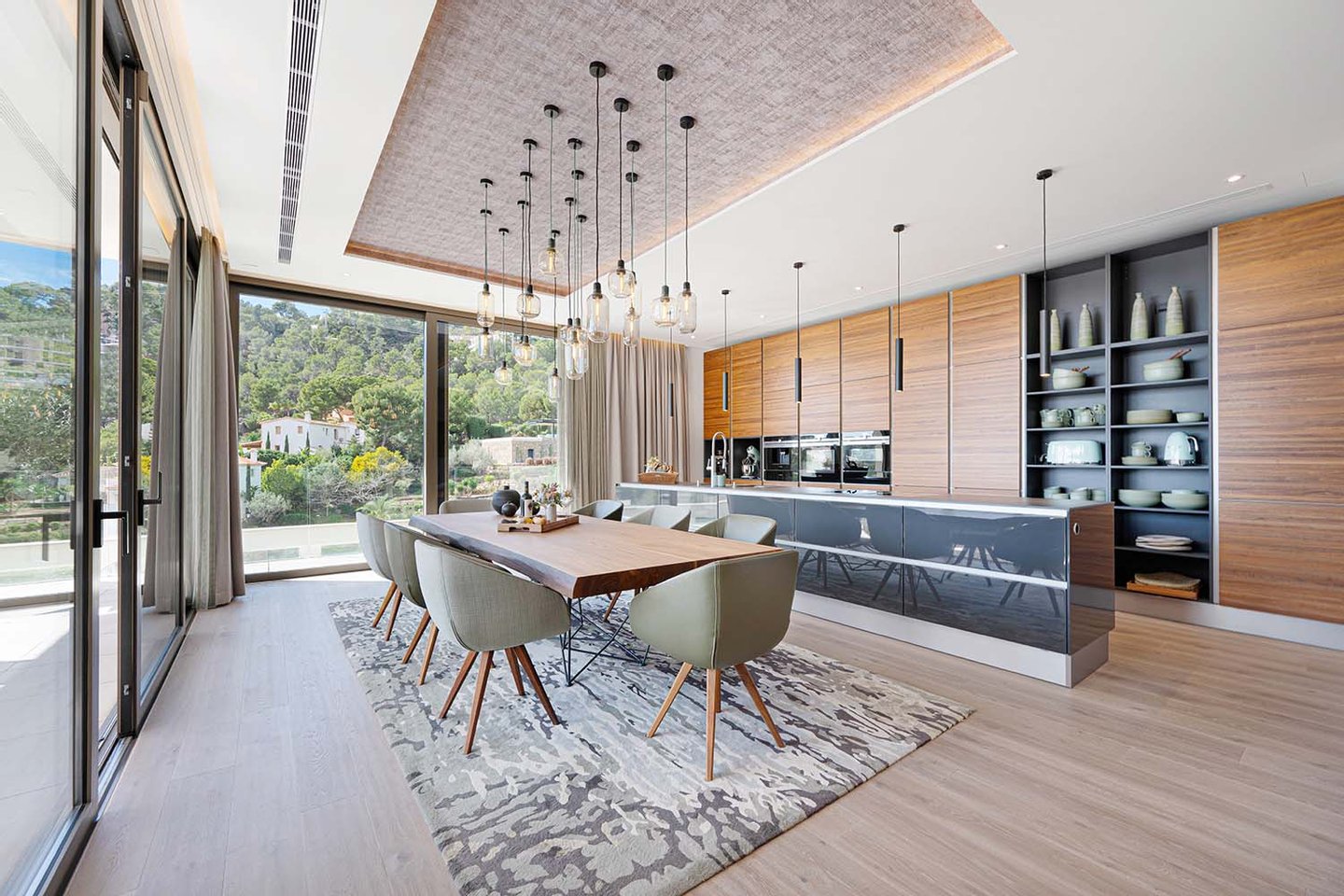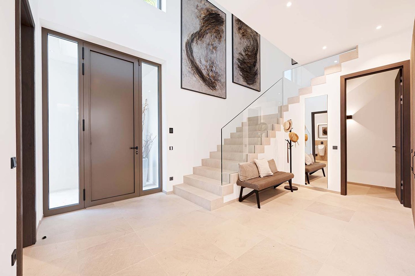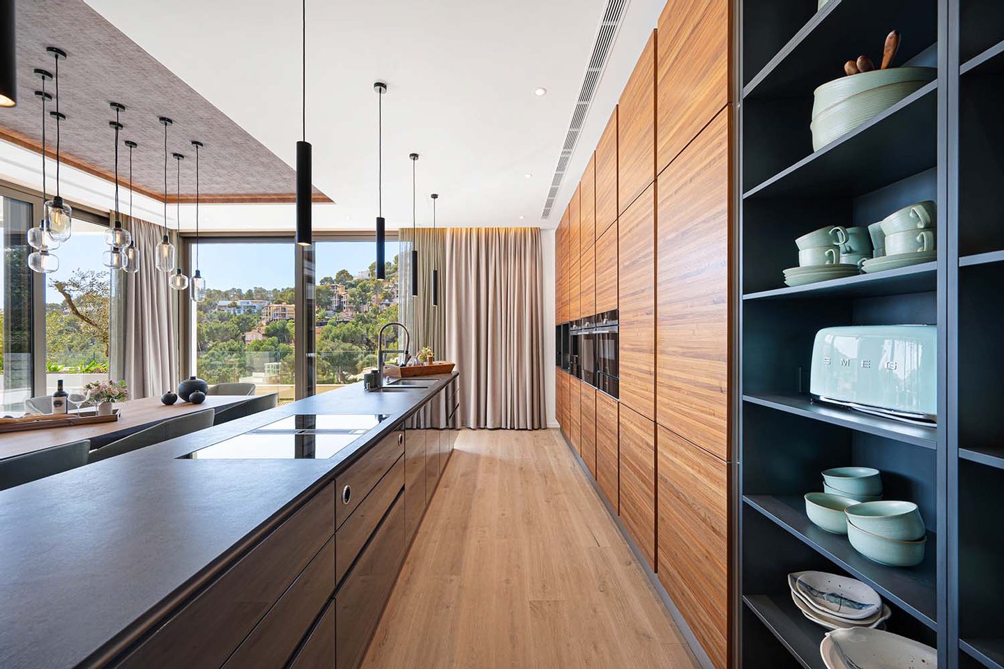 Modernste Technik und höchste Baustandards bis ins kleinste Detail setzen Maßstäbe der Superlative bei dieser einzigartigen Immobilie. Komfortabel erreicht man mit einem Aufzug alle Ebenen des Hauses, von der Garage bis zur großzügigen Dachterrasse und man genießt einen sehr schönen Blick auf den Hafen von Port Andratx und das offene Meer.