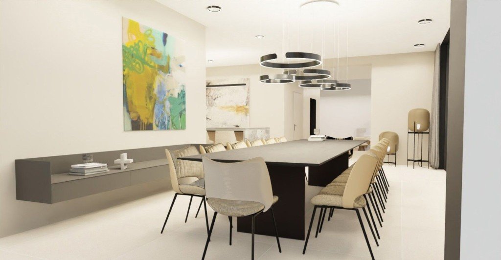 Im Inneren erwartet Sie eine offene Designerküche, ergänzt durch eine zweite, professionell ausgestattete Küche. Das großzügige Wohn und Esszimmer mit Kamin öffnet sich harmonisch zum Außenbereich. Die Villa verfügt über sieben geschmackvoll gestaltete Schlafzimmer und acht Badezimmer (sieben en suite), sowie einen Hauswirtschaftsraum und einen Abstellraum.