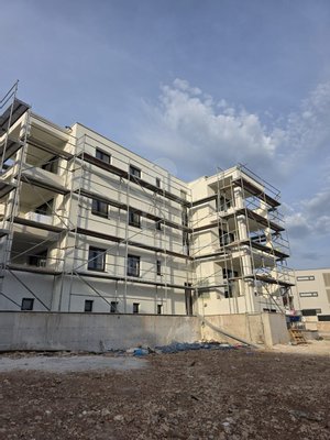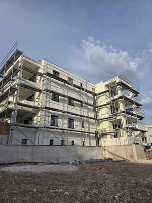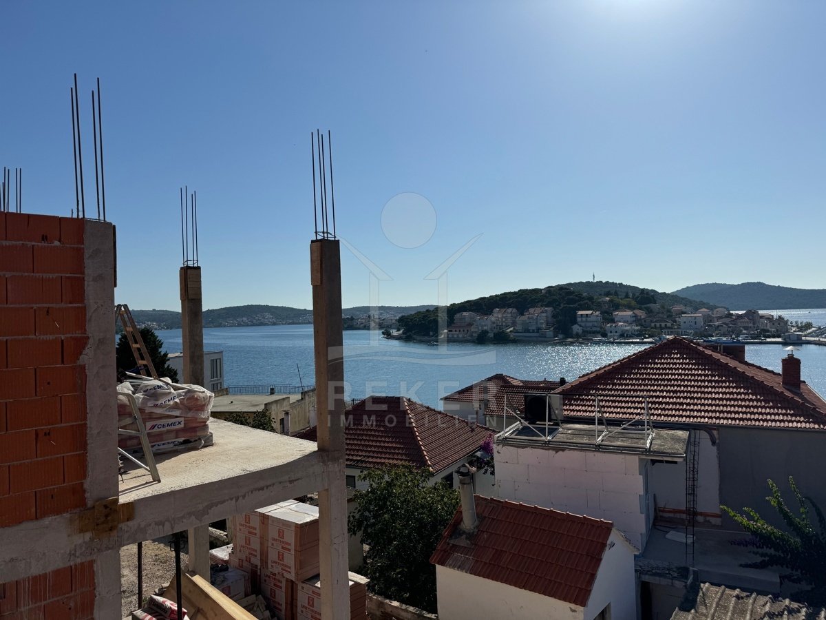 Nur 60 Meter zum Meer. Das Haus steht in dritter Reihe in Rogoznica, leicht am Hang. Das bringt einen besseren Blick aufs Meer. Ruhige Nachbarschaft, kurze Wege, klare Struktur. Und: Jeder hat seinen eigenen Parkplatz direkt vorm Haus. Sieben Wohnungen. Vier Etagen. Fertig im Sommer 2025. Neubau, Erstbezug, saubere Linien.
