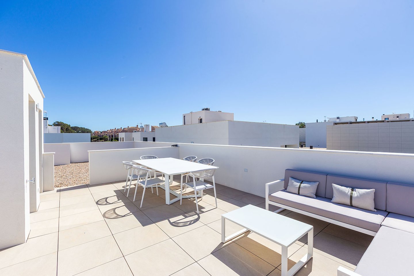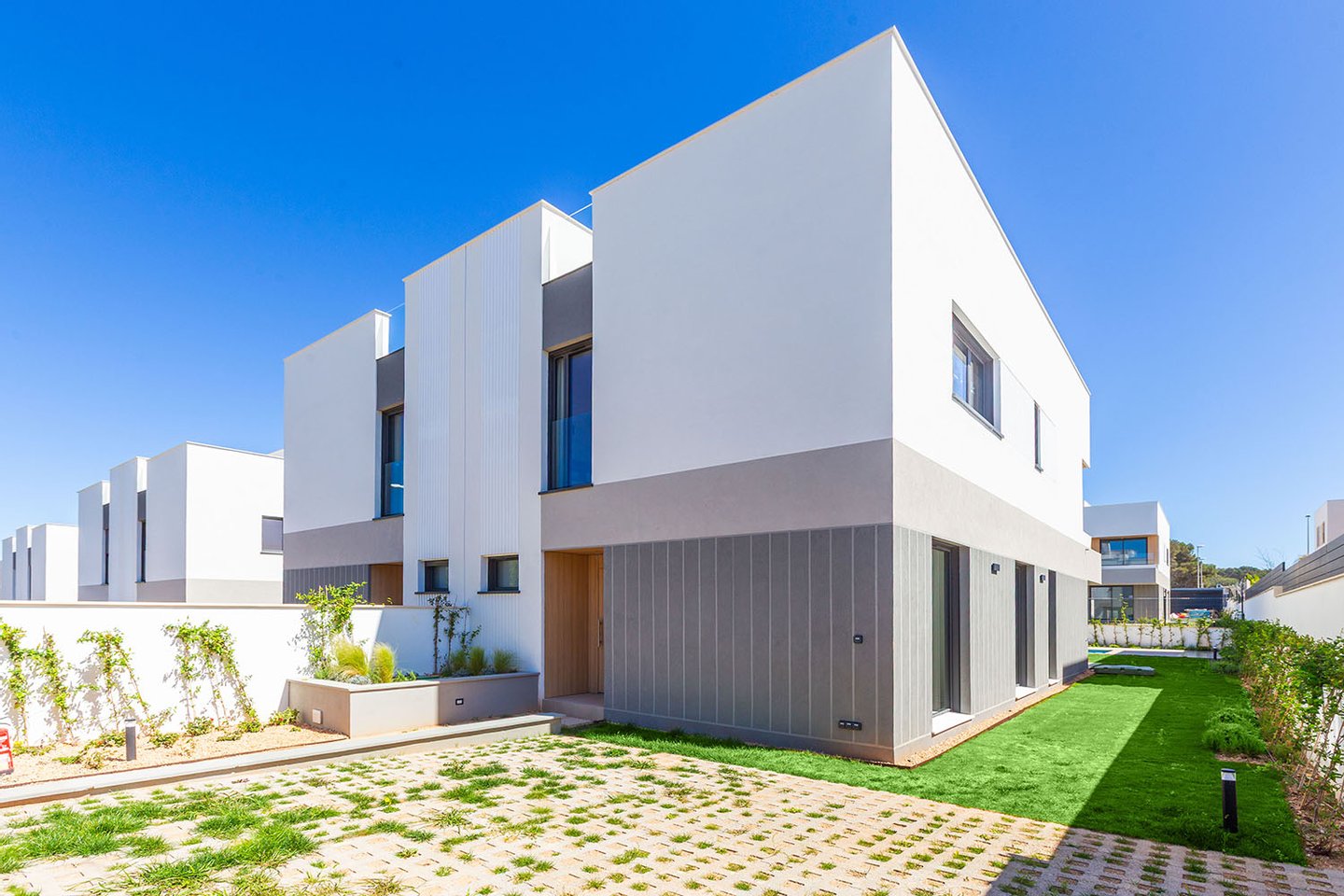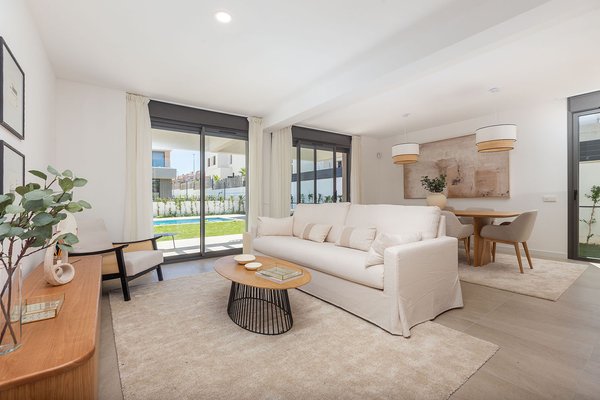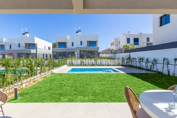 Die eindrucksvollen Villen bieten insgesamt drei Schlafzimmer (plus Mehrzweckzimmer) und drei Badezimmer, verteilt auf zwei Ebenen. Darüber hinaus verfügen sie über einen großen Garten, einen privaten Salzwasserpool und zwei Parkplätze.