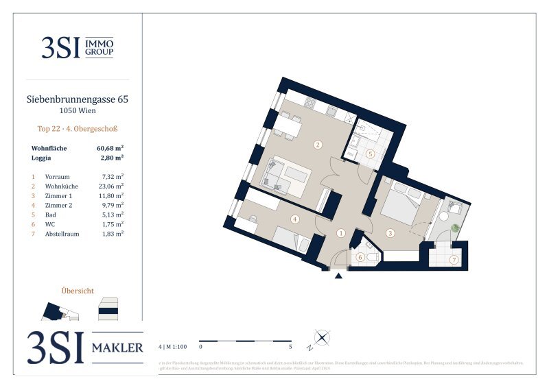 Diese moderne 3-Zimmer-Wohnung überzeugt mit ihrem durchdachten Grundriss zur Gänze. Die Wohnräume sind Ostseitig ausgerichtet. Vom Vorraum aus lassen sich alle Räume zentral begehen. Die Nassräume sind mit hochwertigem Feinsteinzeug und Markenarmaturen ausgestattet. Das Badezimmer beinhaltet eine moderne Walk-In Dusche, sowie ein Handwaschbecken und einen Waschmaschinenanschluss. Straßenseitig ausgerichtet sind die offene Wohnküche, sowie das kleinere der beiden Schlafzimmer. Das Masterbedroom, mit praktischer Nische für einen Kasten und eigener Loggia zeigt zur Gänze in den absolut ruhigen Innenhof. Von der Loggia aus gelangt man zum praktischen Abstellraum.