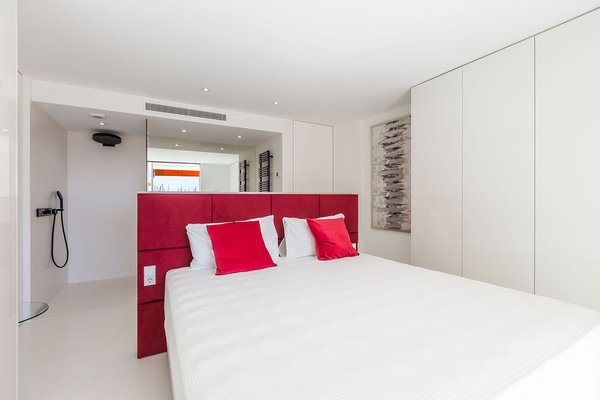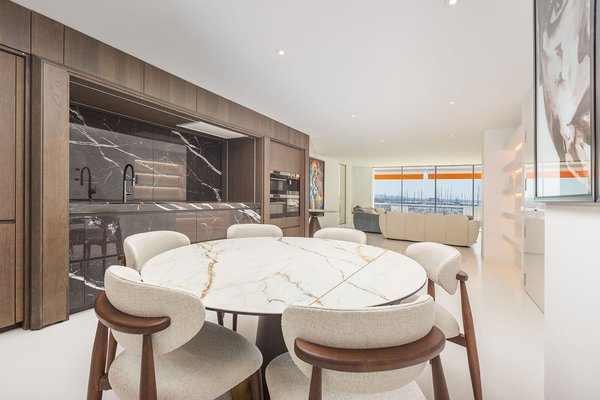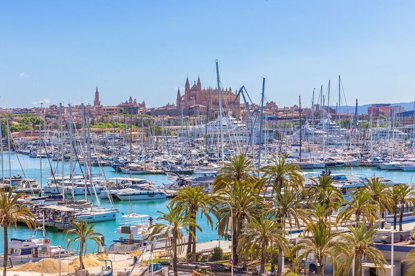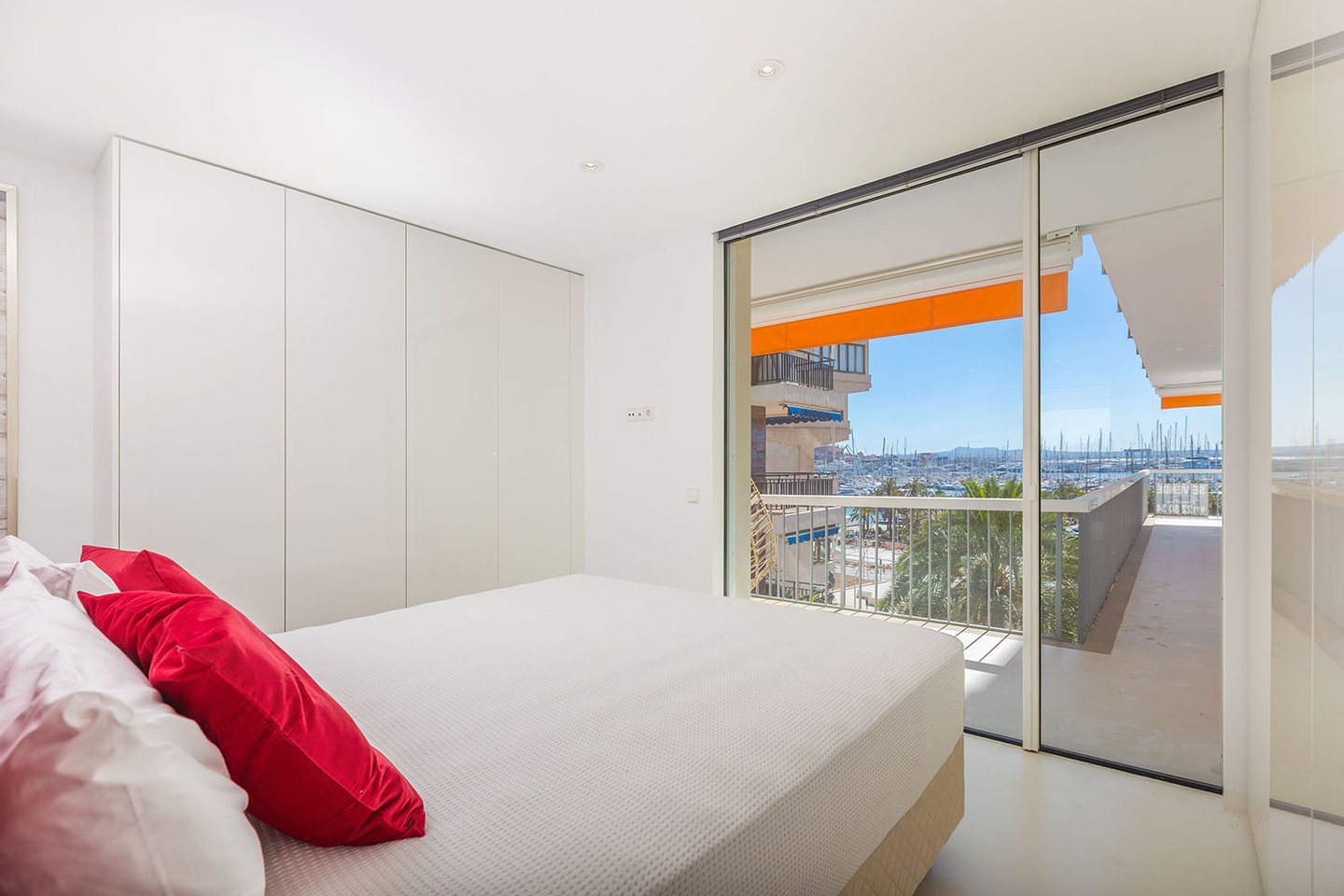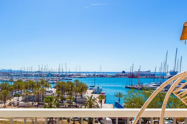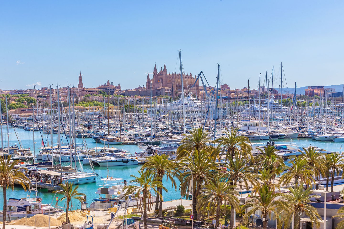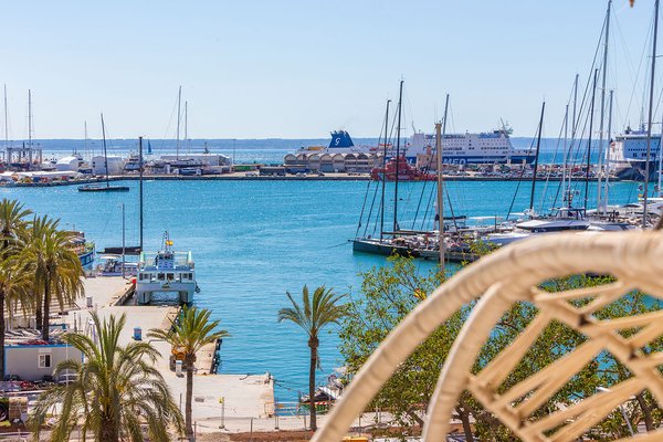 Großzügige Fensterfronten eröffnen einen malerischen Blick über den Hafen bis zur Kathedrale und dem Tramuntana-Gebirge im Hintergrund.