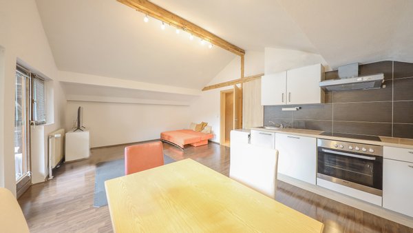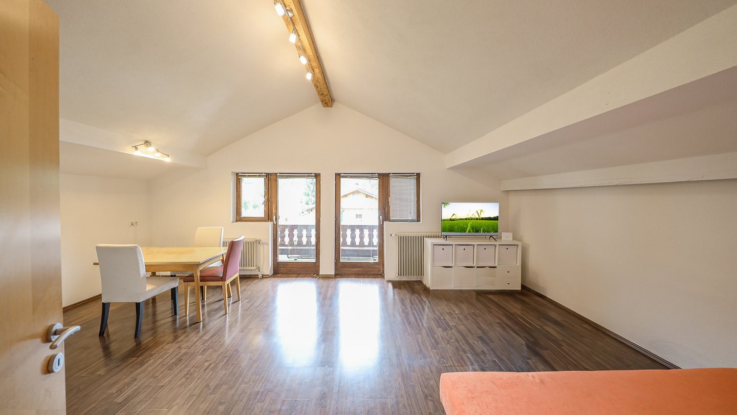 Die Dachgeschosswohnung besticht vor allem durch den Sichtdachstuhl und die damit verbundene Raumhöhe. Die Wohnung teilt sich in den großzügigen Wohn-Essbereich mit Küchenzeile, einem Badezimmer mit Dusche und WC sowie einem Schlafraum auf. Weiters verfügt sie über einen Balkon in Richtung Südberge.