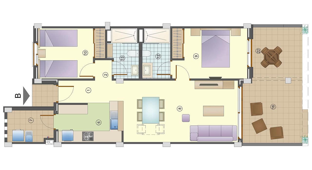 Diese liebevoll gestalteten Erdgeschoss-Wohnungen verfügen über eine konstruierte Fläche (inklusive Terrassen) von ca. 95 m² - 97 m² mit