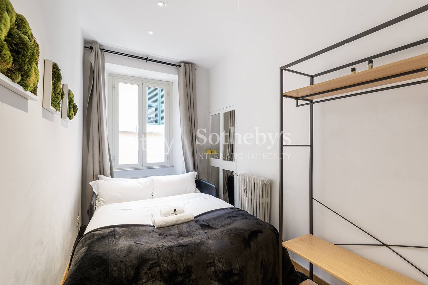 Die Wohnung verfügt über zwei helle und ruhige Schlafzimmer, beide geschmackvoll eingerichtet, mit Parkettböden und hochwertigen architektonischen Details, darunter eine elegante, gepolsterte Wandverkleidung (Boiserie) sowie große Fenster mit Blick auf ein herrliches architektonisches Panorama der Ewigen Stadt. Ein modernes Badezimmer rundet die Immobilie ab.
