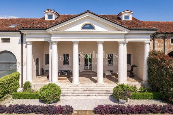 Die Villa verfügt über einen majestätischen Vorgarten sowie einen privaten, 3.800 Quadratmeter großen rückseitigen Park mit Swimmingpool. Die Fassade des Anwesens umfasst eine große Loggia mit fünf Bögen in abgeflachter Form, durch die man in die Innenräume gelangt.
