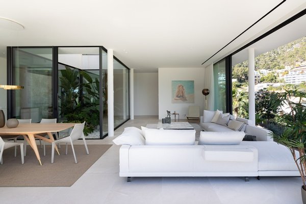 Im Herzen des Erdgeschosses befindet sich ein üppiges, lichtdurchflutetes Atrium, um das herum die Wohnräume angeordnet sind. Von hier aus gelangen Sie in eine elegante Eingangshalle, eine praktische Speisekammer und einen Hauswirtschaftsraum, ein geräumiges Doppelschlafzimmer mit eigenem Bad sowie einen offenen Küchen-, Ess- und Wohnbereich. Die Innenräume sind auf mehreren Ebenen angeordnet, die die abgestuften Außenterrassen widerspiegeln und einen dynamischen und harmonischen Fluss schaffen. Raumhohe Glastüren im Wohnbereich öffnen sich zur Terrasse, lassen die natürliche Schönheit herein und erweitern den Wohnraum nach draußen mit einem eigenen Ess- und Wohnbereich.