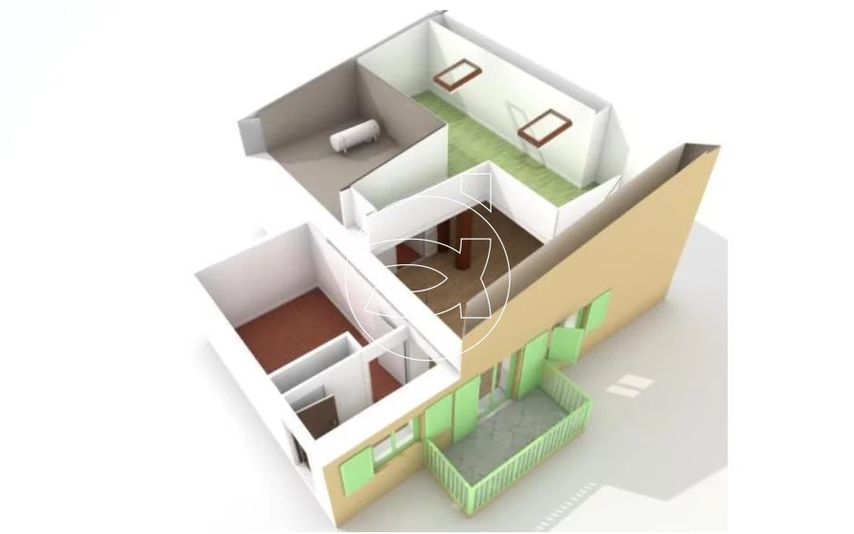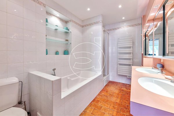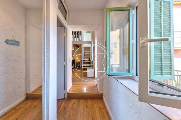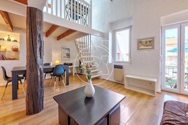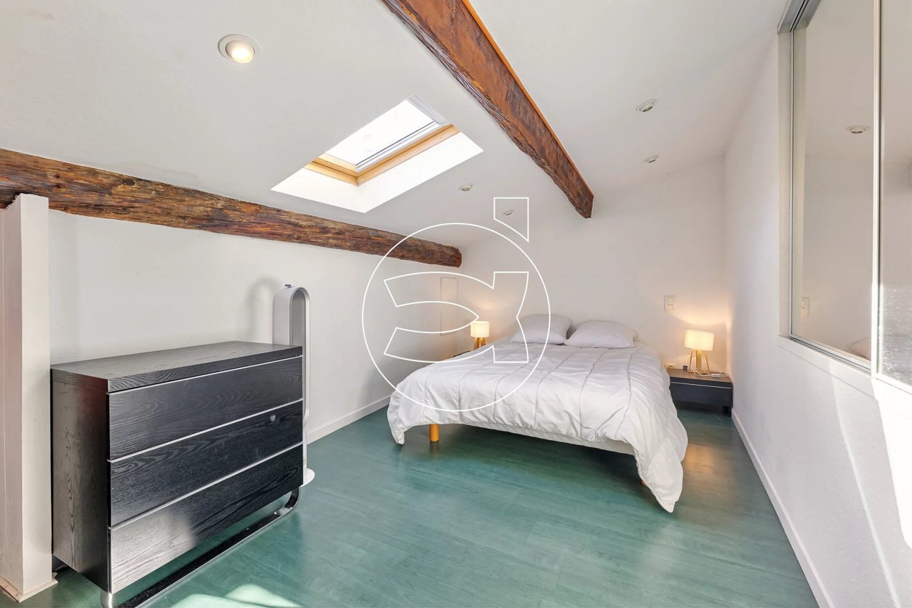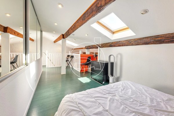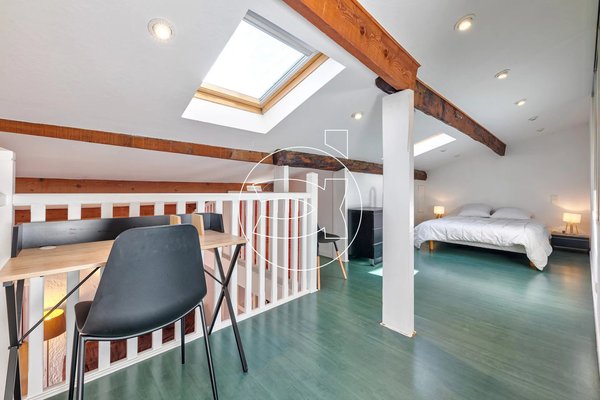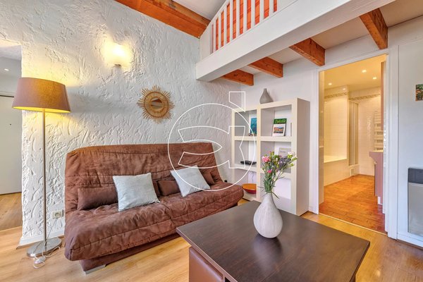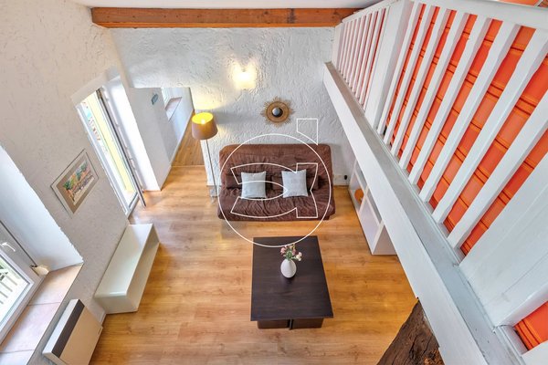 Ein Balkon von fast 4 m² ist vom Wohnzimmer aus zugänglich. Die Wohnung verfügt über ein großes Schlafzimmer sowie ein zweites Schlafzimmer auf einer Zwischenetage. Ein Badezimmer mit Dusche und WC vervollständigt das Angebot. Es gibt viel Stauraum.