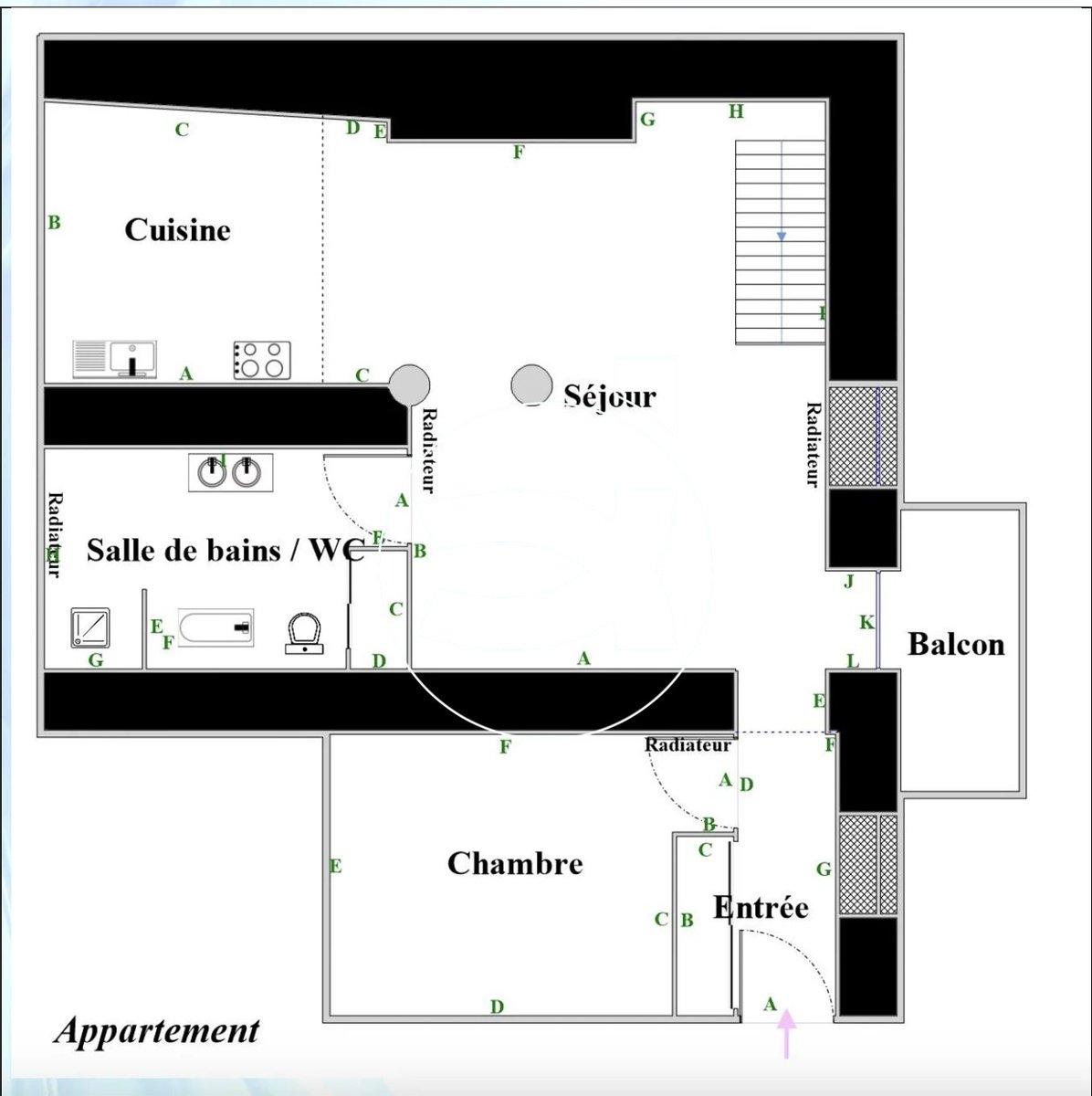 Sie verfügt über eine Fläche von 62 m² und liegt im 2. und letzten Stock eines kleinen Wohngebäudes.