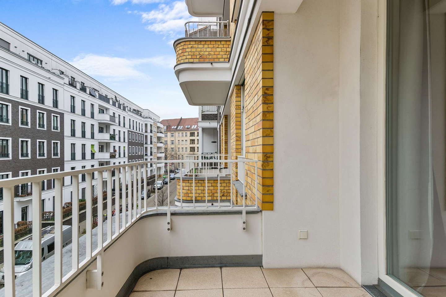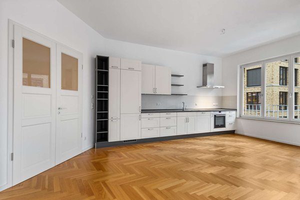 Diese stilvolle Wohnung im 2. Obergeschoss eines modernen Neubaus aus dem Jahr 2014 verbindet urbanes Lebensgefühl mit zeitgemäßem Wohnkomfort, mitten im Friedrichshain. Die Wohnung ist bequem per Aufzug erreichbar. Der großzügige Eingangsbereich verfügt über ausreichend Platz für eine Garderobe und führt in den offen gestalteten Wohn-, Ess- und Kochbereich- das Herzstück der Wohnung. Große Fenster lassen das Tageslicht aus zwei Himmelsrichtungen einfallen und schaffen eine warme, einladende Atmosphäre. Edles Eichenparkett verleiht dem Raum zusätzlich eine wohnliche Eleganz. Ob gemütliche Abende mit Freunden oder entspannte Familienmomente – hier treffen Geselligkeit und Lebensfreude auf modernes Design. Die angrenzende Loggia erweitert den Wohnraum nach draußen und wird an warmen Tagen zum Lieblingsplatz im Freien.