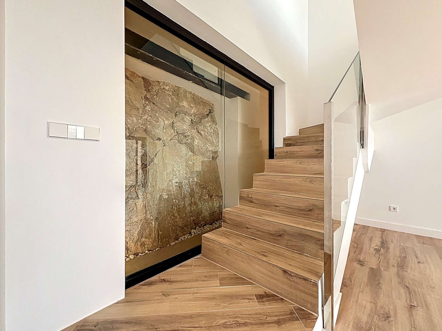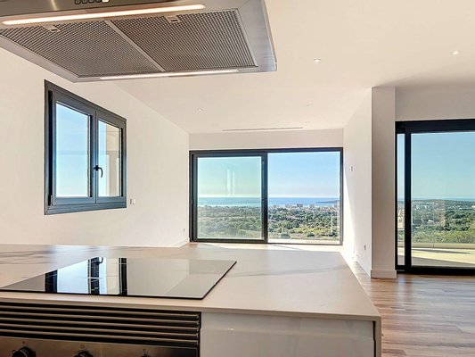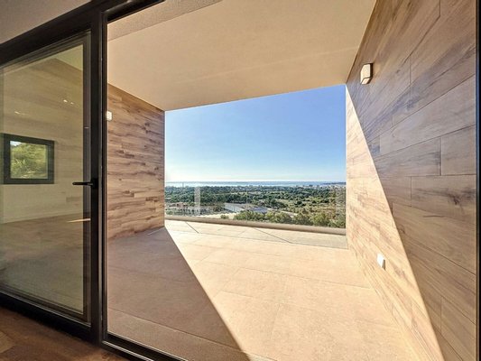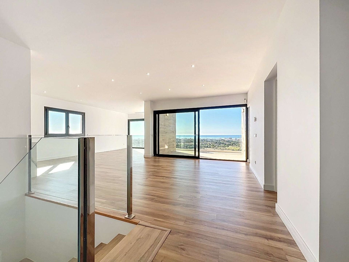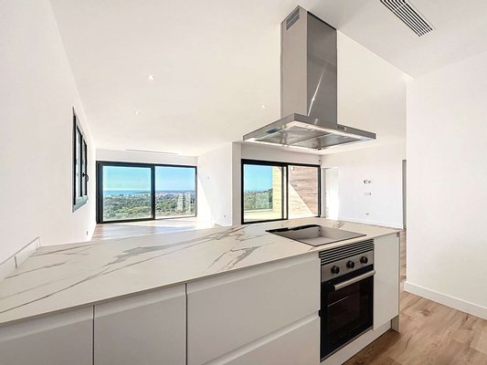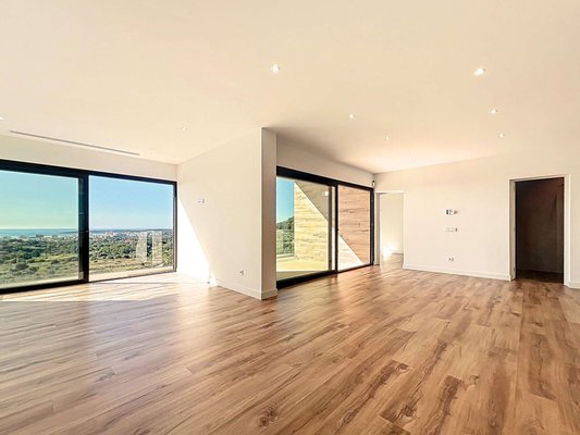 Im oberen Stockwerk befinden sich der Haupteingang, ein großzügiges und lichtdurchflutetes Wohn-Esszimmer mit offener, voll ausgestatteter Küche, eine überdachte Terrasse mit Meerblick, ein Doppelzimmer mit eigenem Bad, ein Gäste-WC sowie ein Hauswirtschaftsraum.