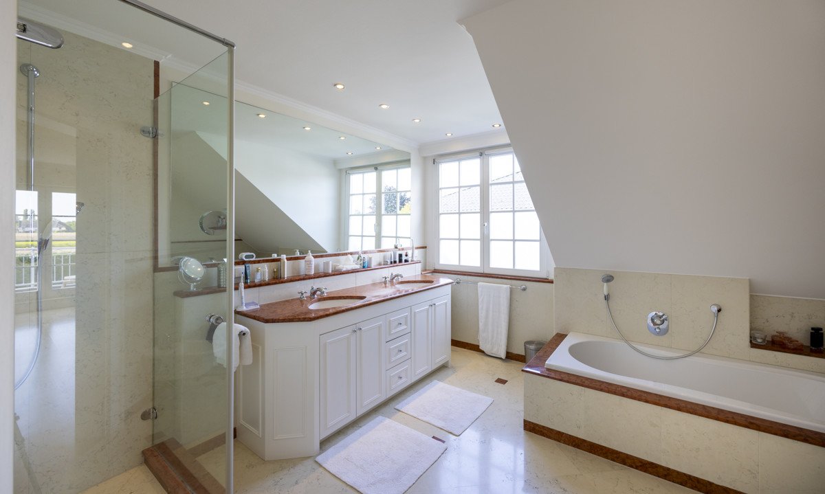 Hochwertige Ankleideschränke in drei Schlafzimmern ermöglichen viel Stauraum. Beide Tageslichtbäder verfügen über eine Wanne und Dusche und sind mit hochwertigem Marmor ausgestattet. Die Waschtischunterschränke wurden nach Maß gefertigt.