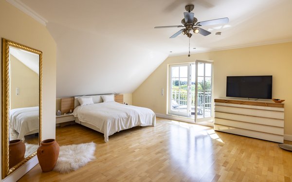 großes Masterschlafzimmer mit Bad en suite inkl. Wanne und Dusche sowie Zugang zum großen Süd-Balkon