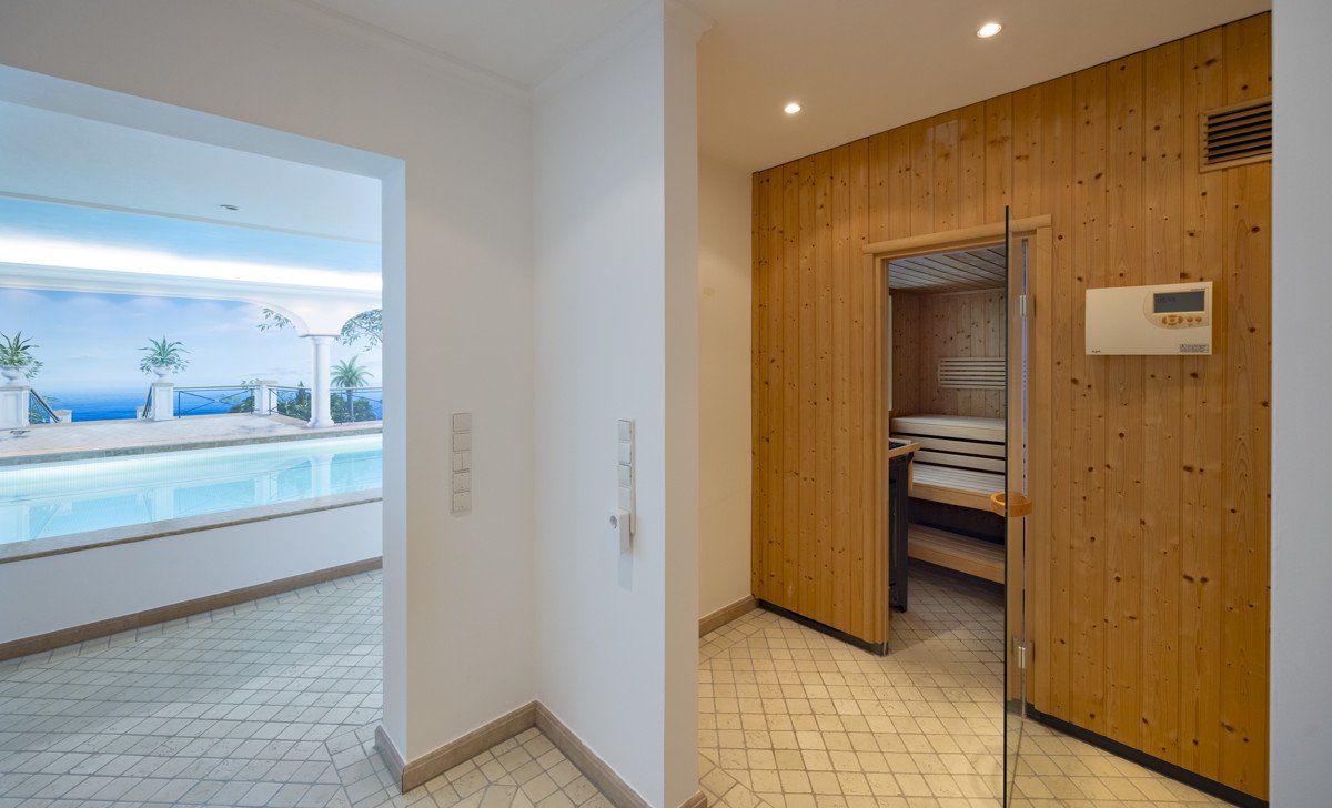 •Sauna für 4 Personen und Fenster in das Schwimmbad