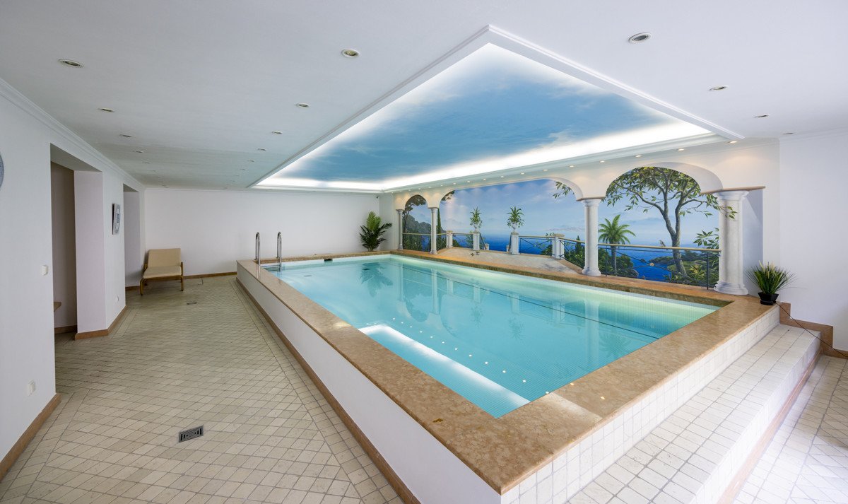 •Innenschwimmbad 4 m x 8 m mit Gegenstromanlage, Beleuchtung sowie Wand- und Deckenbemalung