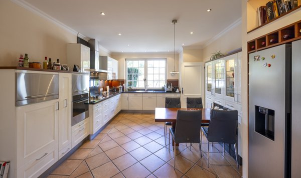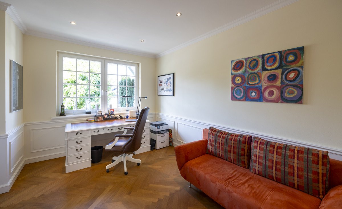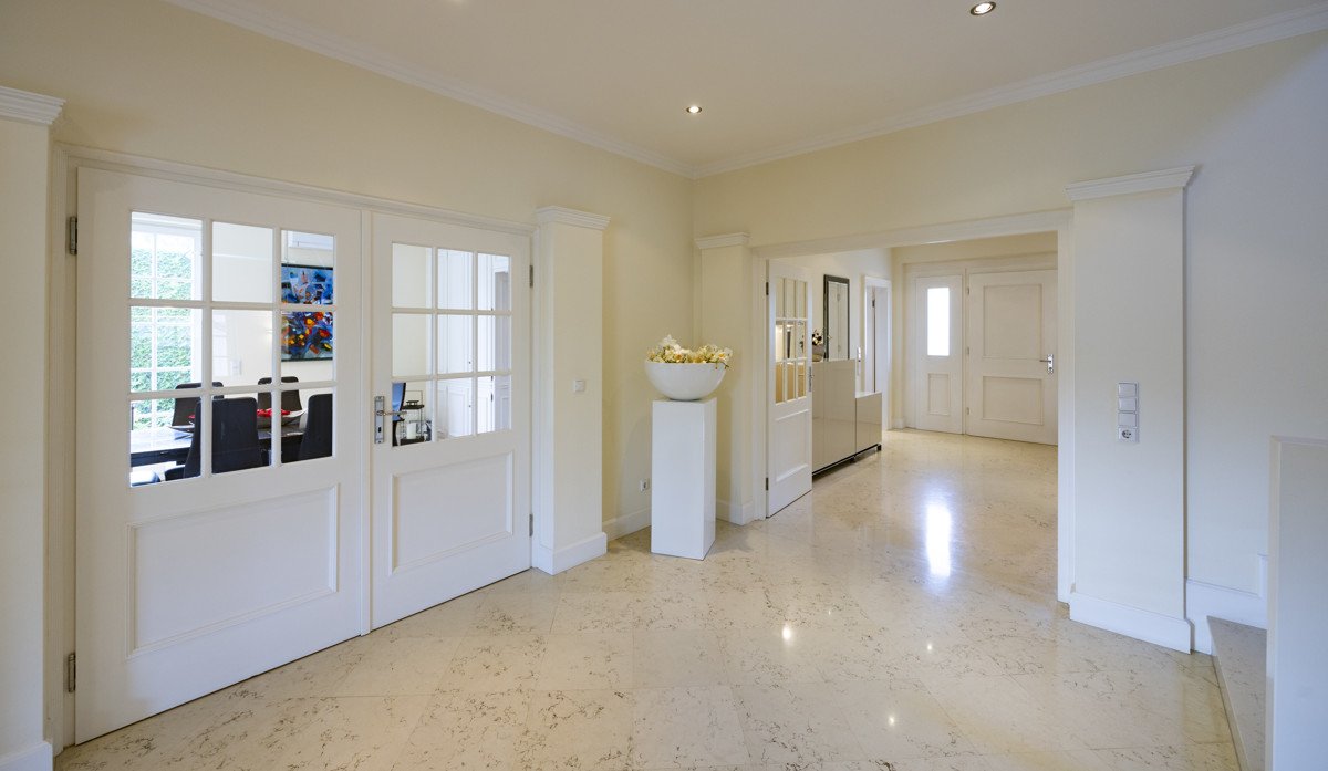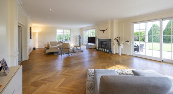 Über eine mit hellem Marmor versehene Eingangshalle heißen wir Sie herzlich willkommen. Die großen Sprossenfenster lassen alle Räume erstrahlen. Auf der linken Seite befindet sich ein elegantes Arbeitszimmer. Weiter führt von der Halle der Blick durch den großzügigen Wohnraum mit angrenzendem Garten. Dieser ist mit einem geölten Fischgrät-Parkett und einem Kamin ausgestattet. Große Fensteranlagen lassen sich aufschieben und verbinden die ca. 60 m² teilüberdachte Terrasse mit dem Wohnraum. Zum Vorgarten ausgerichtet befindet sich die großzügige Landhausküche und das anschließende Esszimmer, welches auch mit der Küche oder dem Wohnraum offen gestaltet werden kann. Ein Duschbad komplettiert das Erdgeschoss. Zwei Großraumgaragen sind komfortabel mit dem Haus verbunden. Eine Garage verfügt über einen praktischen Zugang zur Küche.