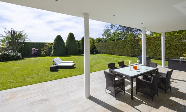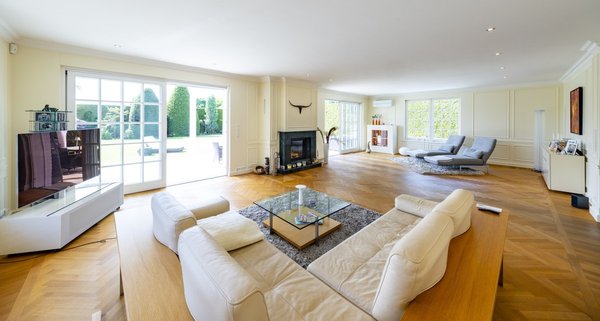 großer Wohnbereich mit Kamin zur Gartenseite ausgerichtet