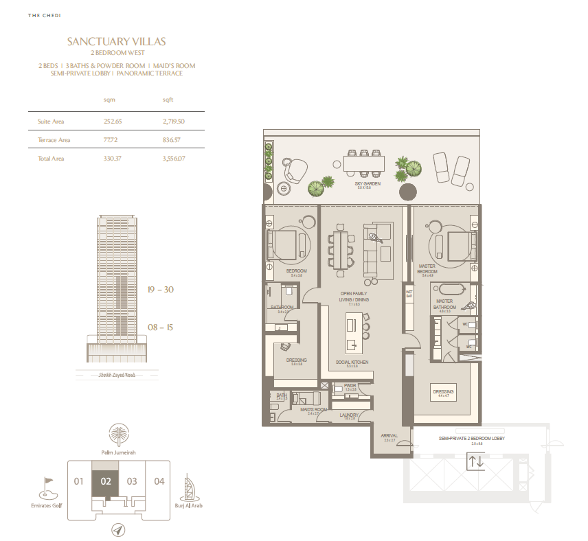 Willkommen in den exklusiven Chedi Private Residences mit einem 2 Bedroom Luxury Apartment und einem Zimmer für das Hauspersonal mit eigenem Badezimmer. Hier erwarten Sie luxuriöse Annehmlichkeiten und ein prestigeträchtiger Lebensstil inmitten atemberaubender Sky Gardens mit Blick auf die Skyline von Dubai.