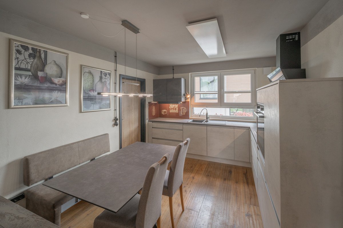 Beim Betreten des Hauses empfängt Sie ein heller und sonnendurchfluteter Wohnbereich, der nahtlos in den Essbereich übergeht und sich perfekt für gesellige Abende mit Freunden und Familie eignet. Die großzügige Küche bietet Ihnen reichlich Platz zum Kochen und Genießen, jedoch ohne Einbauküche, sodass Sie diese nach Ihrem eigenen Geschmack gestalten können.