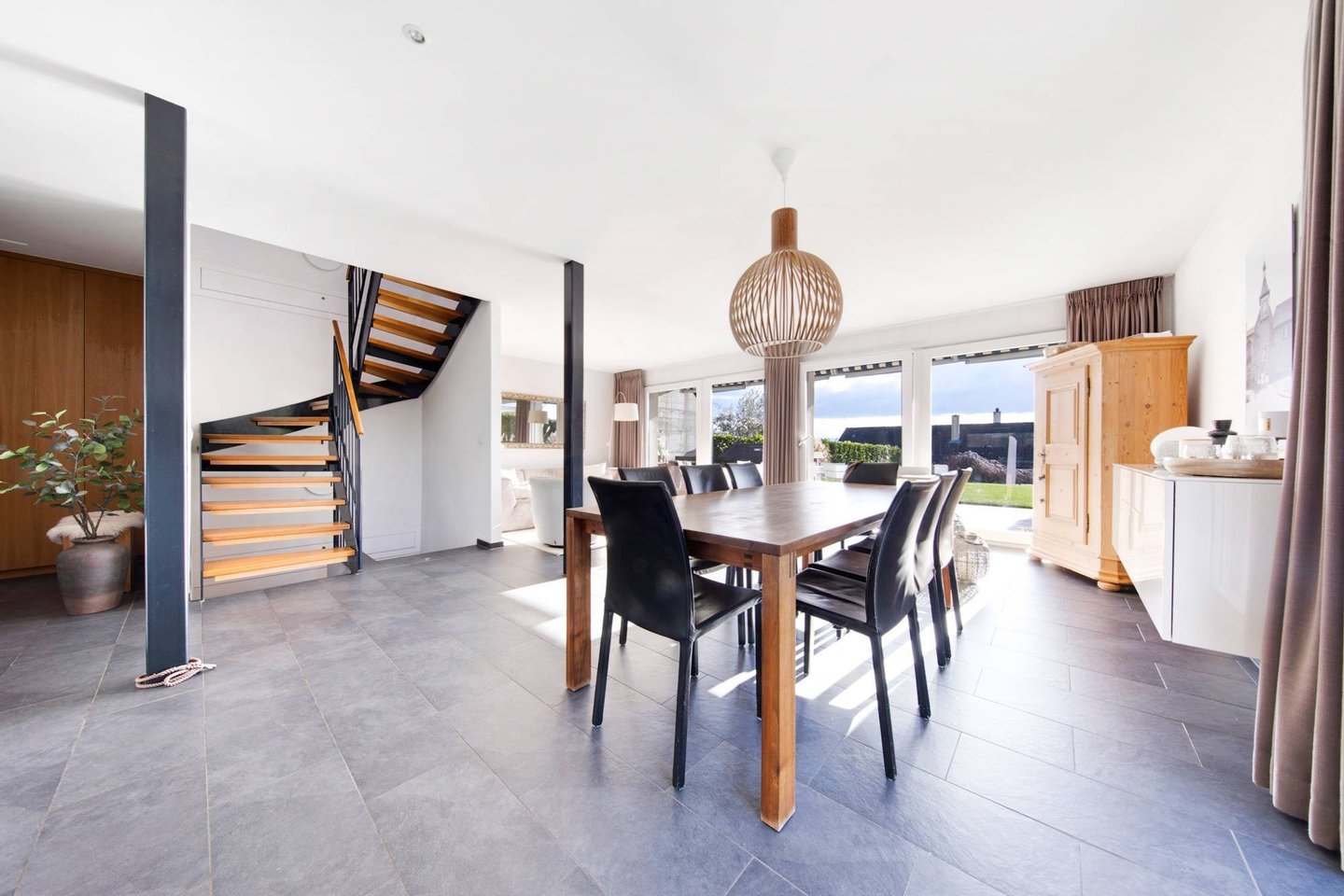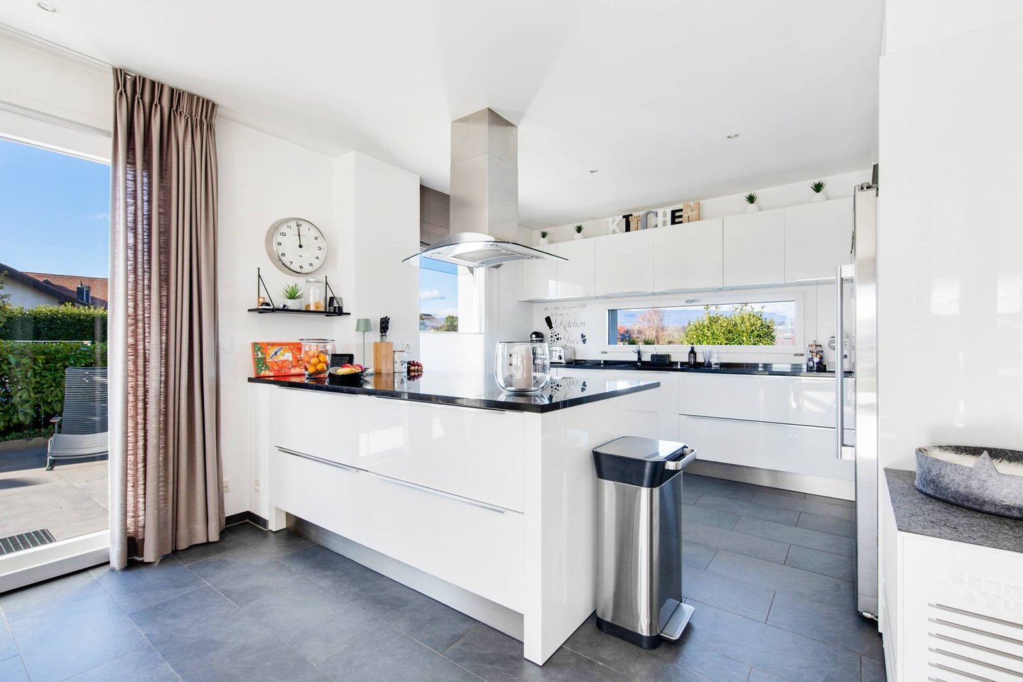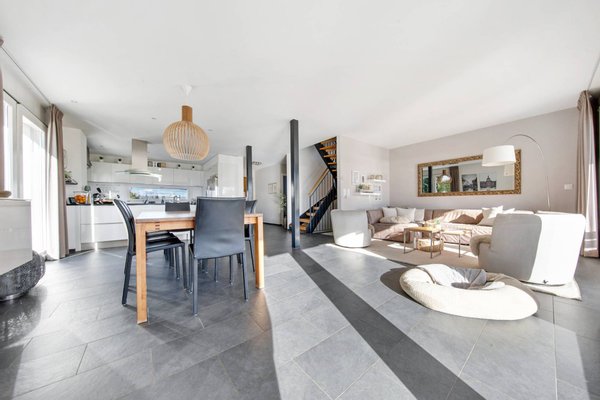 - Eingangshalle mit Schrank, ein Gäste-WC und eine moderne Küche mit zentraler Insel, die sich zu einem großen, lichtdurchfluteten Wohnzimmer mit direktem Zugang zur Terrasse und zum Garten öffnet.