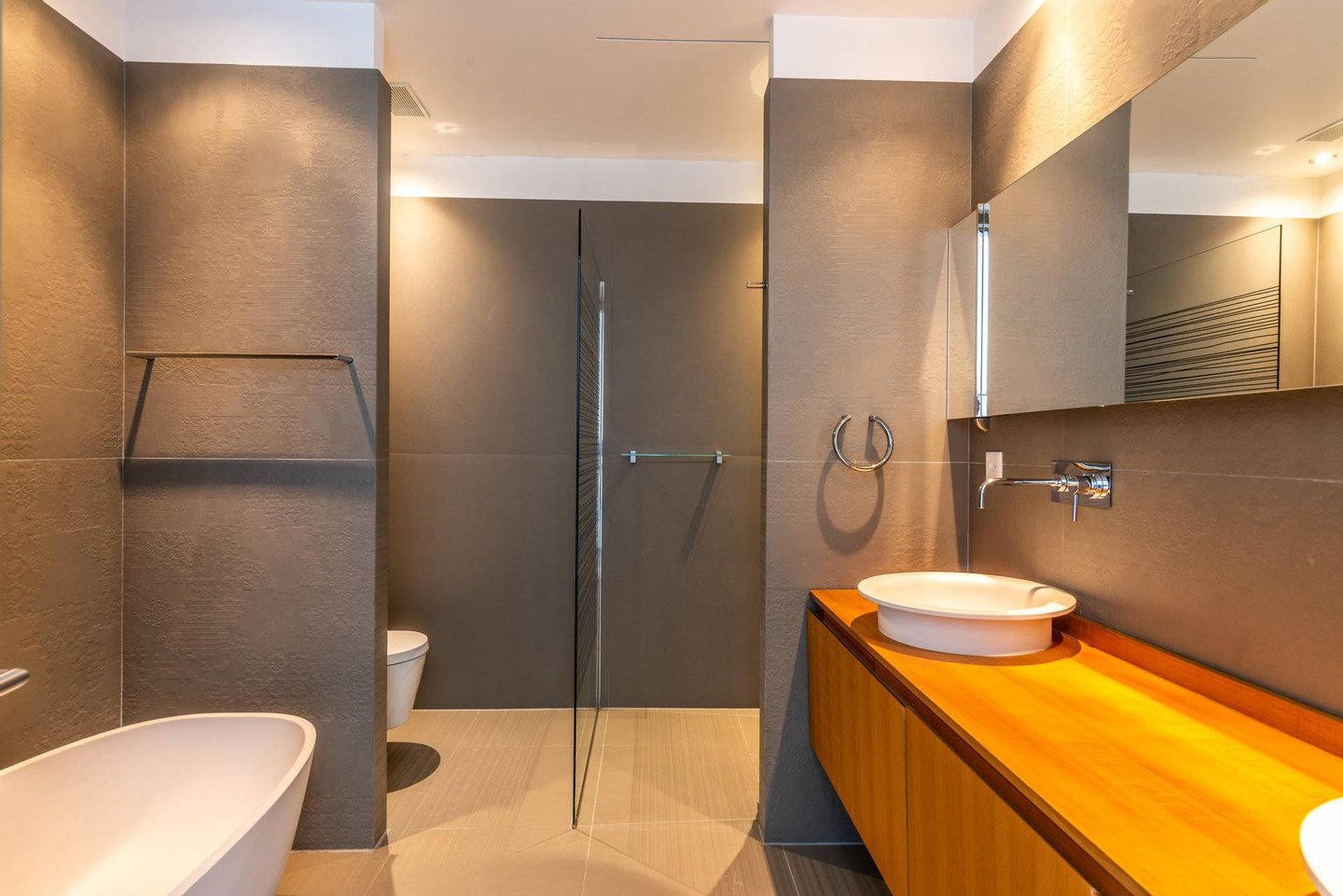 Das Obergeschoss bietet, alle nach Südwesten ausgerichtet, 3 herrliche Schlafzimmer/Suiten mit Dusche oder Badewanne sowie eine Master-Suite mit Badewanne, Dusche und Ankleideraum.