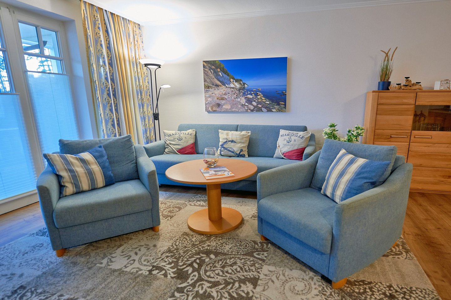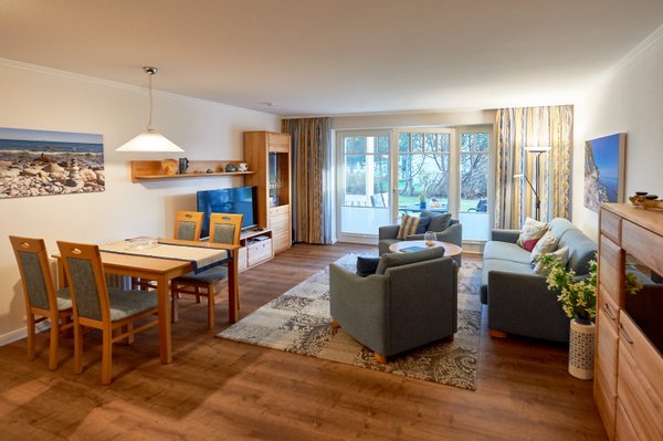 Vom Flur aus gelangt man in den komfortabel ausgestatteten Wohnbereich mit ausziehbarer Couch, 2 Sesseln, Esstisch für 4 Personen, Smart-TV und BluRay-Player. Die harmonisch in den Wohnraum integrierte, hochwertige Küchenzeile ist mit einem 4-Zonen-Ceran-Herd inkl. Backofen, Mikrowelle, Kühlschrank mit Gefrierfach, Geschirrspüler und diversem Kleininventar vollumfänglich ausgestattet. Eines der Highlights der Wohnung ist die dem Wohnzimmer vorgelagerte, überdachte Terrasse mit Süd-Ost-Ausrichtung - das Meeresrauschen gibt´s bei günstigem Wind gratis dazu. Das Appartement verfügt weiterhin über ein großzügig geschnittenes, helles Schlafzimmer mit Verdunklungsvorhängen und einem bequemen Doppelbett (2x2 m) in Komforthöhe. Das moderne Duschbad mit italienischem Granit, großen Spiegelflächen und Deckenspots unterstreicht den gelungenen Gesamteindruck der Wohnung. Ein großzügiger Verbindungsraum zwischen Schlafzimmer und Badezimmer dient als begehbarer Kleiderschrank und Abstellraum gleichermaßen.