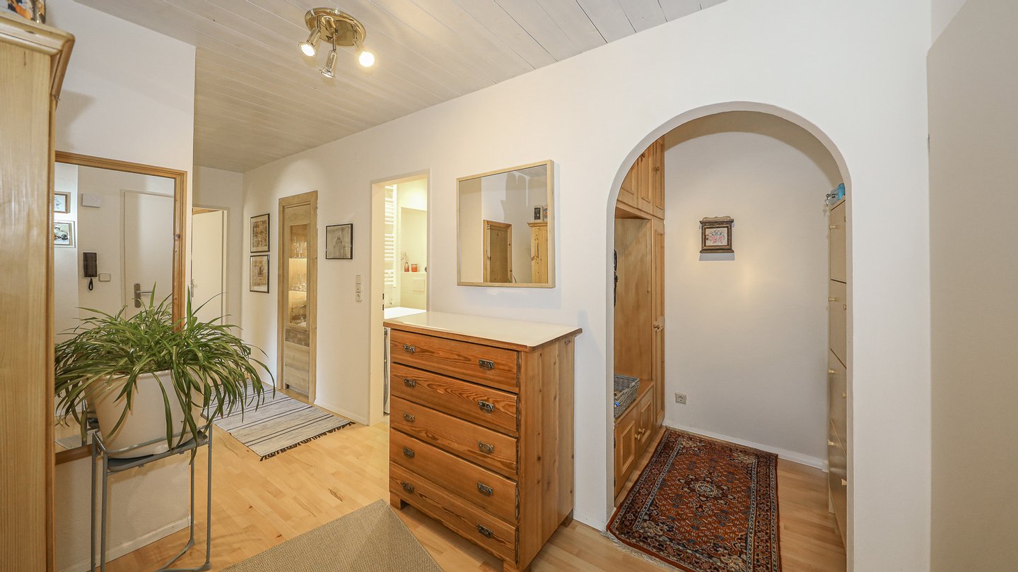 Eingangsbereich mit Garderobe, Abstellraum, eine separate Toilette, zwei Schlafzimmer, ein saniertes Badezimmer mit Dusche und Waschmaschine, Küche sowie Wohnraum, von welchem man auf die Loggia gelangt.