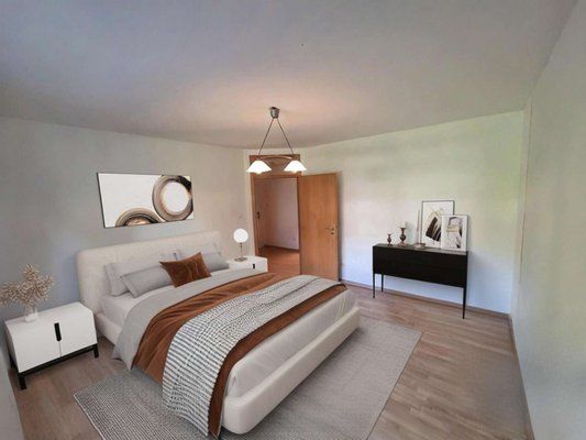 Daneben liegt das ruhige Schlafzimmer mit Blick ins Grüne, abschließbaren Fenstern und elektrischen Rollläden – ideal für erholsame Nächte.