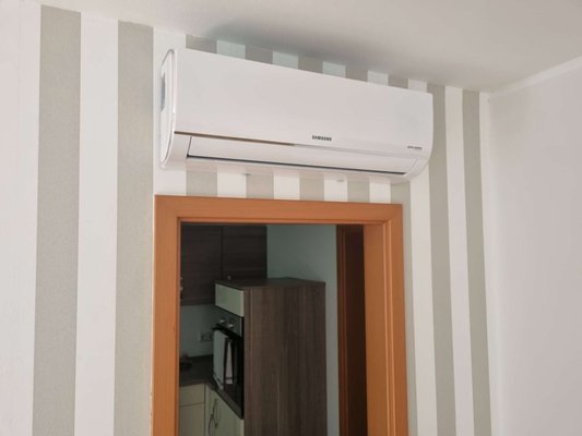 Klimaanlage; Einbauküche (Backofen in Arbeitshöhe, in 2022 neue Siemensspülmaschine); elektrische Rollos in allen Räumen außer dem Bad; Sicherheitswohnungstür mit Keycard neu, in 2014 saniertes Bad mit Hänge-WC (Villeroy & Boch), Handtuchheizkörper,