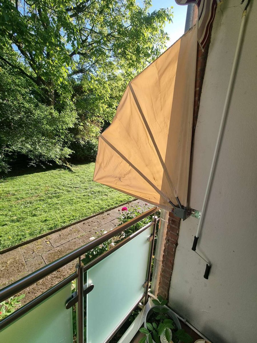 Vom Eingang aus links betritt man das helle Wohnzimmer (elektrische Rollläden). Es bietet Platz für einen Wohn- und Essbereich. Von hier aus gelangt man auf den Balkon mit Markise und Sonnensegel – der perfekte Ort zum Entspannen - sowie in die Küche.