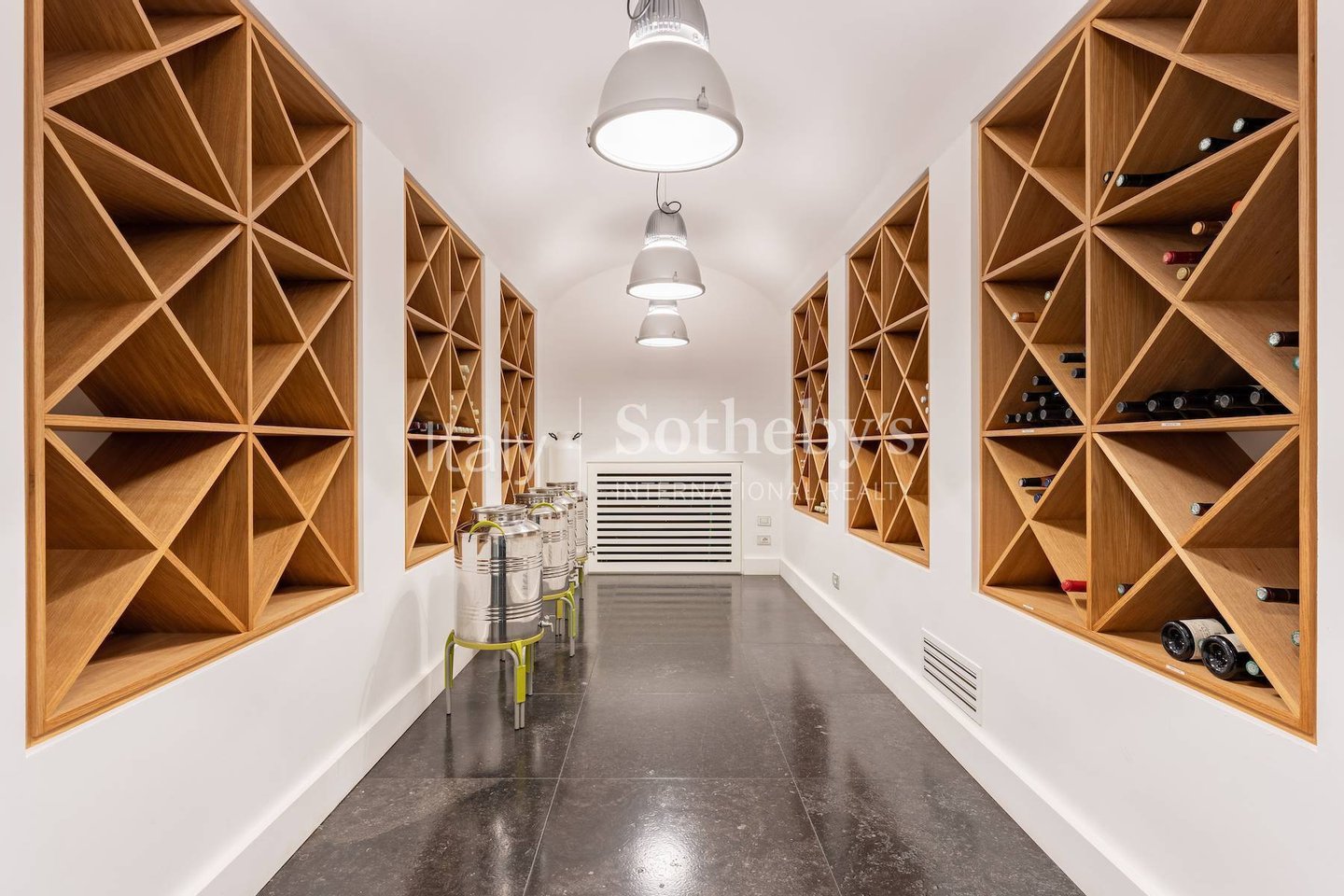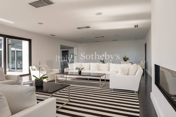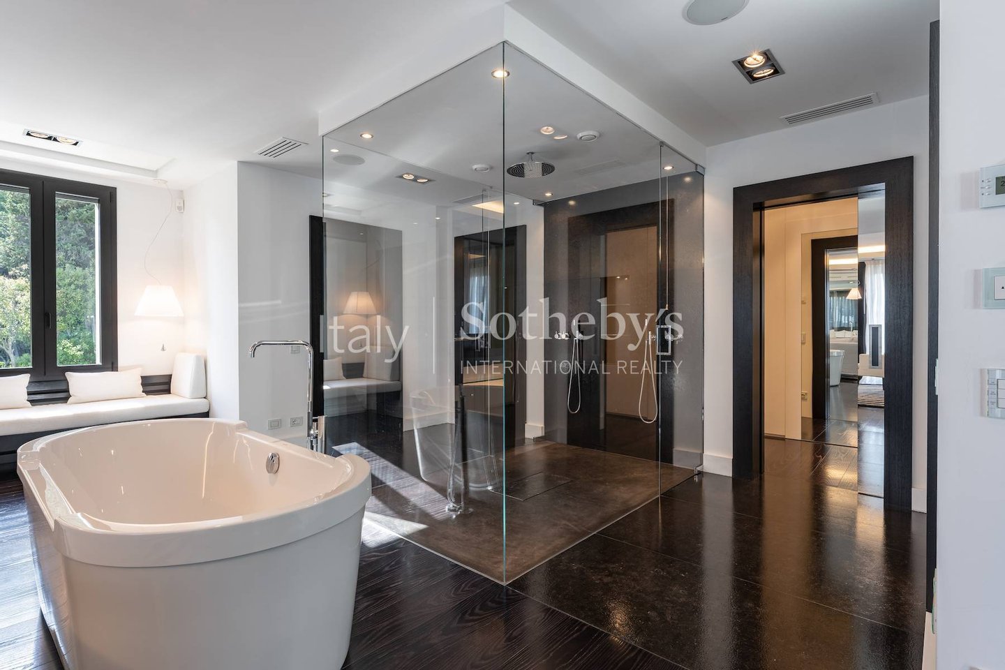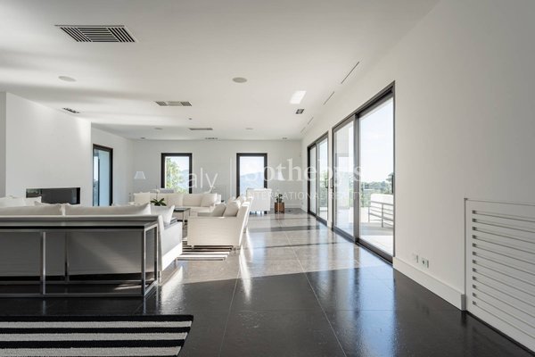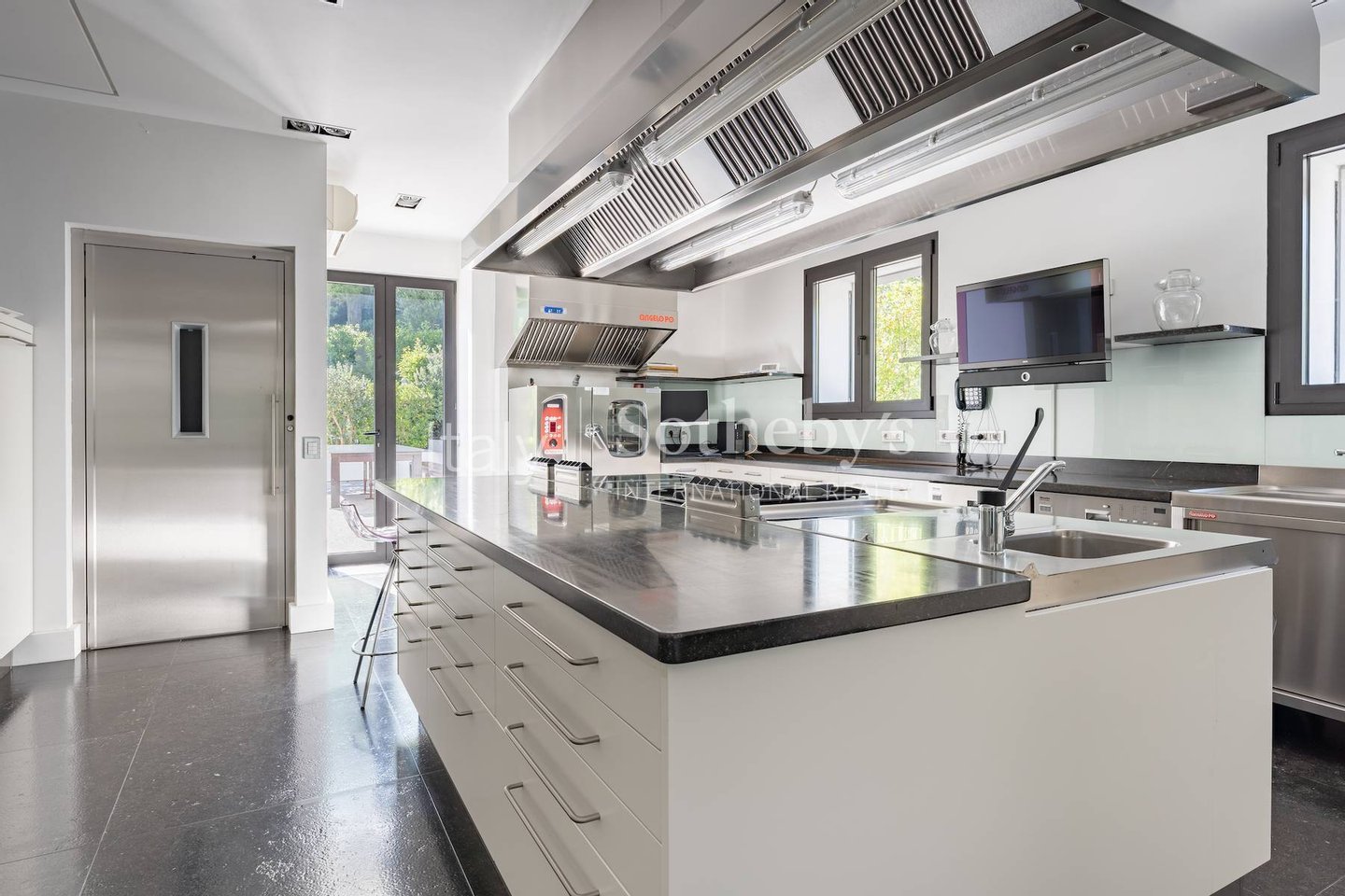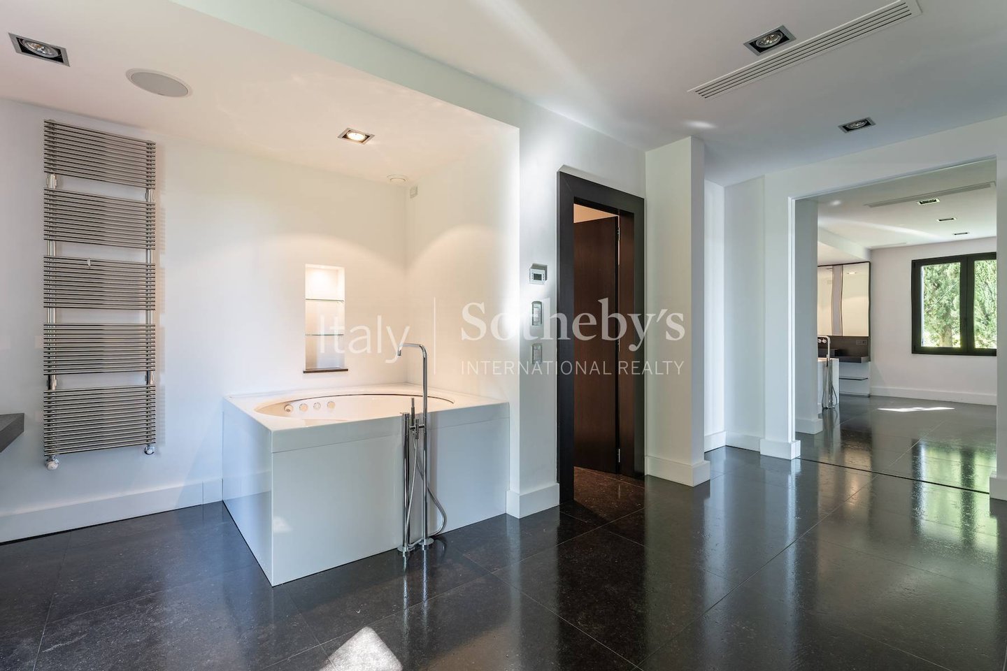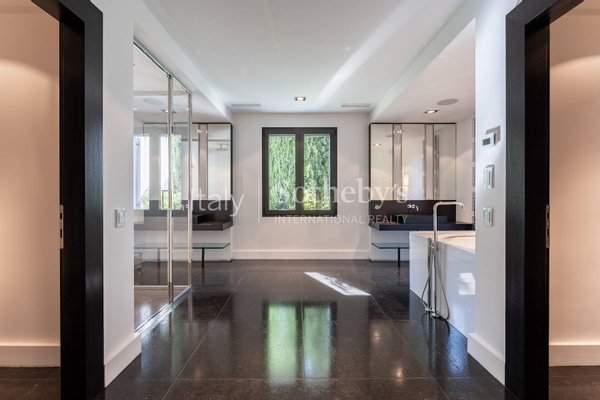 Große und helle Zimmer mit hochwertigen Materialien und tadellosem Stil, das Ergebnis einer raffinierten Innenarchitekturarbeit. Die Villa besteht aus drei großen Sälen, von denen sich zwei symmetrisch zu den beiden Seiten der Haupthalle des majestätischen Eingangs öffnen; drei großzügige Doppelzimmer mit en-suite Badezimmern sowie eine Master-Suite mit eigenem Arbeitszimmer, großem Badezimmer und 2 Schränken; eine große professionelle Küche, private Lounges, ein Hallenbad, ein Fitness- und Entspannungsbereich, ein Weinkeller und zwei interne Aufzüge. Die Tiefgaragen erstrecken sich über 300 Quadratmeter und bieten Platz für 8 Autos und ein gepanzertes Gewölbe. Es gibt auch einen Grillplatz an der Küche auf einer separaten Terrasse mit Essbereich im Freien, verschiedene Solarien und luxuriöse Gästebäder sowie einen Wasch- und Bügelraum im Erdgeschoss.