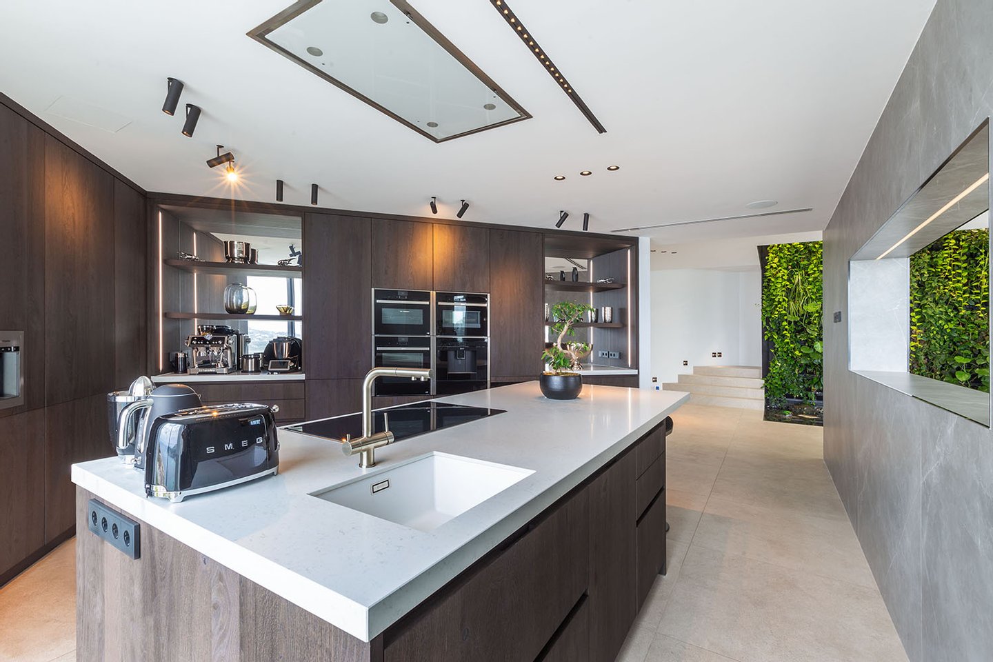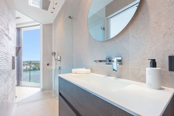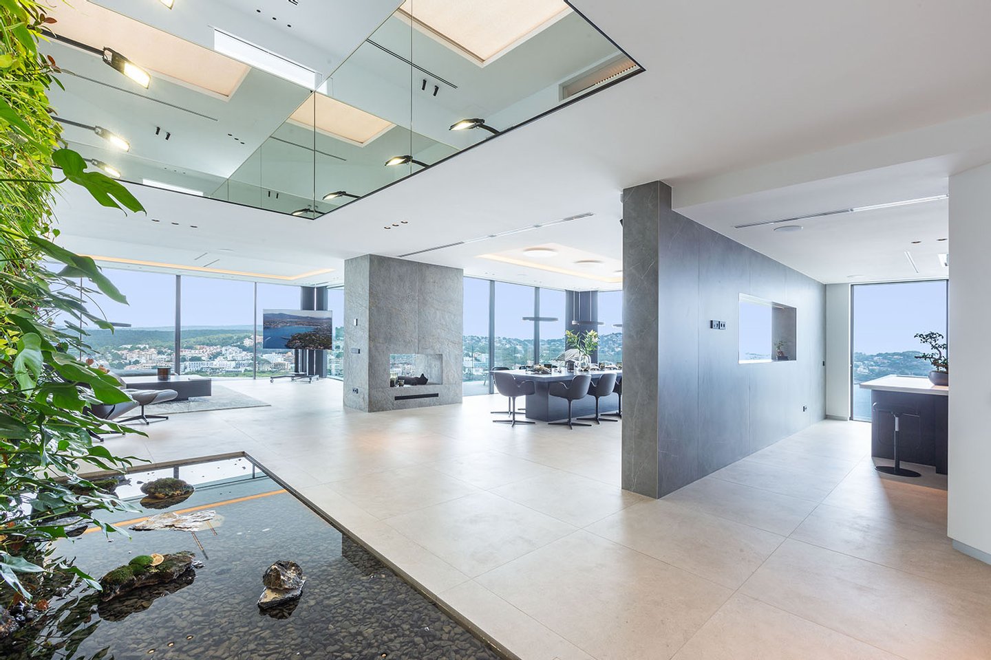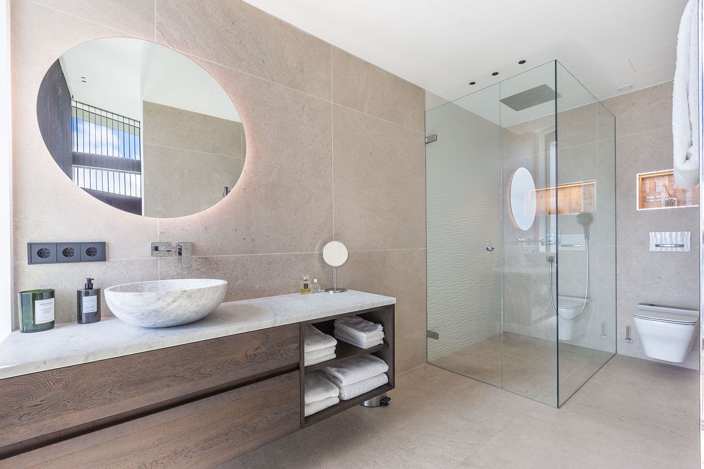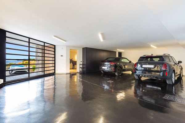 Diese beeindruckende Villa thront auf einem südorientierten Hanggrundstück oberhalb des Ortes in einer sehr ruhigen, aber zentrumsnahen Wohnlage. Die exzellente Lage, eine markante Architektur mit vier Glasfronten und Atrium sowie modernste Haustechnik und ein äußerst exklusives Innendesign verleihen dieser Villa ihre Einzigartigkeit. Eine hervorragende Bauausführung und viele Extras wie SPA-Bereich, Rooftop-Lounge mit Barbecue und Sommerküche, Heimkino/Spielzimmer etc. lassen keine Wünsche offen. Fast alle Räume haben zwei Glasfronten, die sensationelle Blicke freigeben und die Grenzen zwischen innen und außen aufheben, wodurch ein grandioses Wohnerlebnis vermittelt wird. Der Wohn-/Essbereich mit Luxusküche, doppelseitigem Designer-Kamin und Teich, ein Wirtschafts-/Technikraum sowie ein Schlafzimmer und ein Bad befinden sich im Erdgeschoss. Von hier hat man Zugang zur Terrasse mit Infinity-Pool. In der oberen Etage gibt es drei Schlafzimmer mit Bädern en suite, ein Fitnessraum (oder Schlafzimmer) und ein Bad. Im Untergeschoss gibt es einen SPA-Bereich mit Sauna und Dampfbad, ein Heimkino bzw. Schlafzimmer, ein Bad und eine Garage.