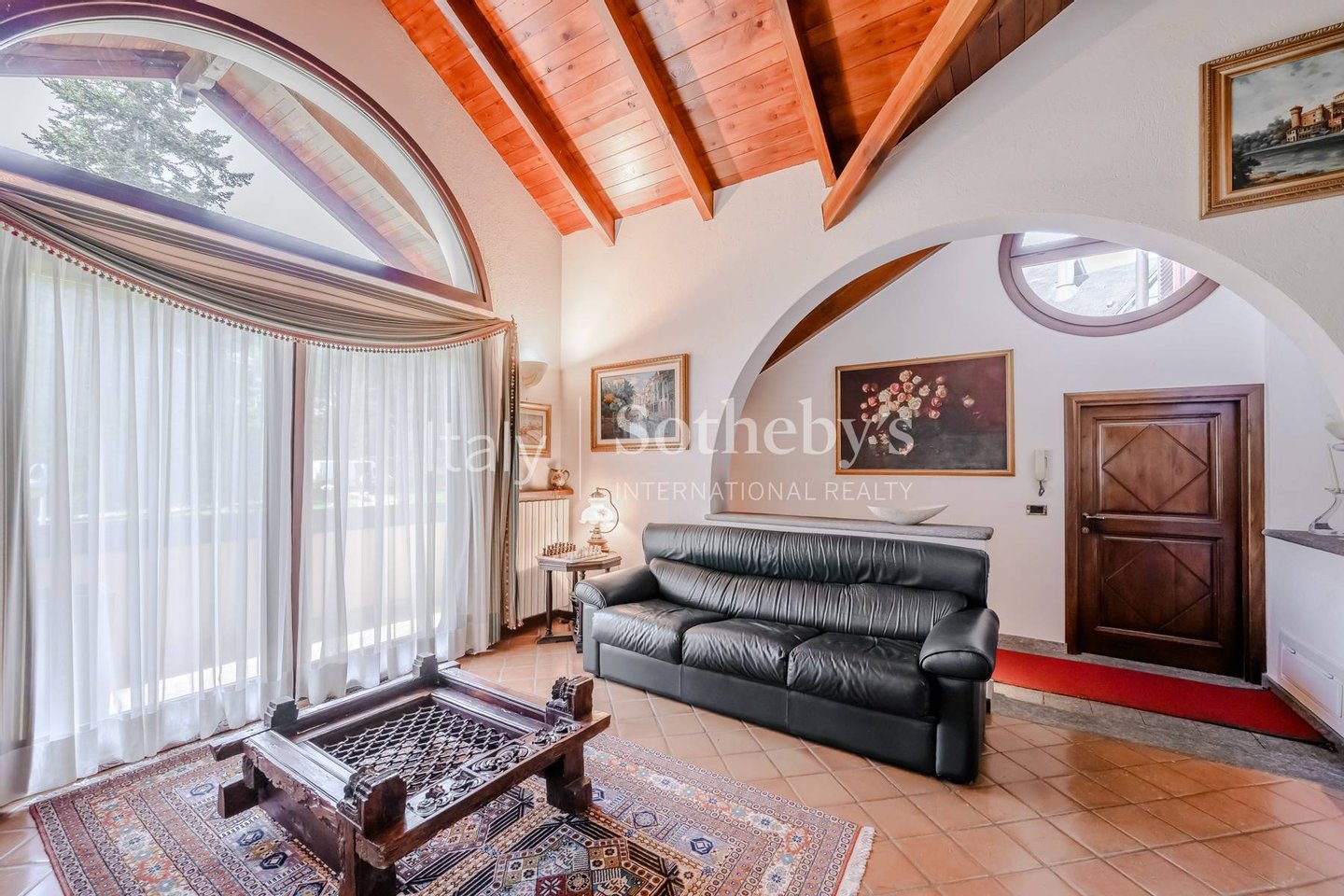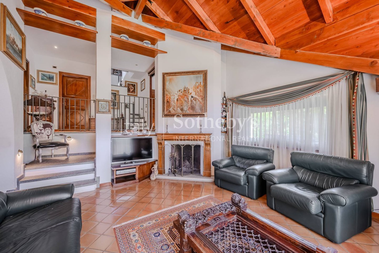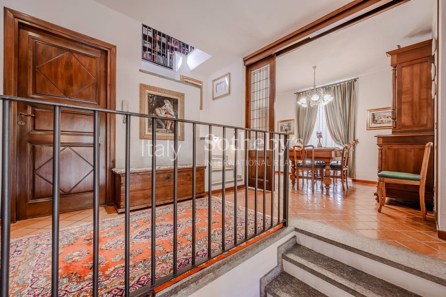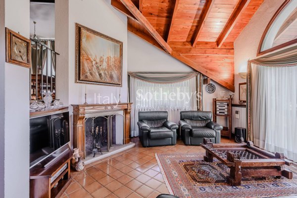 Die Wohnung erstreckt sich über mehrere Ebenen und ist von vier Seiten frei gelegen. Sie besticht durch ihre großzügige Fläche und das außergewöhnliche Licht, das durch die großen Fenster mit Blick ins Grüne hereinströmt. Im Inneren bietet die Immobilie einen großzügigen Wohnbereich mit Kamin, vier Schlafzimmer und vier Bäder.