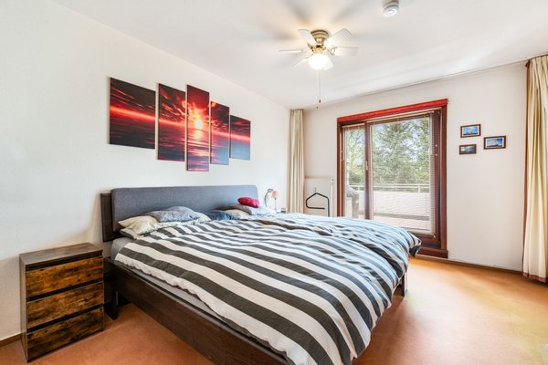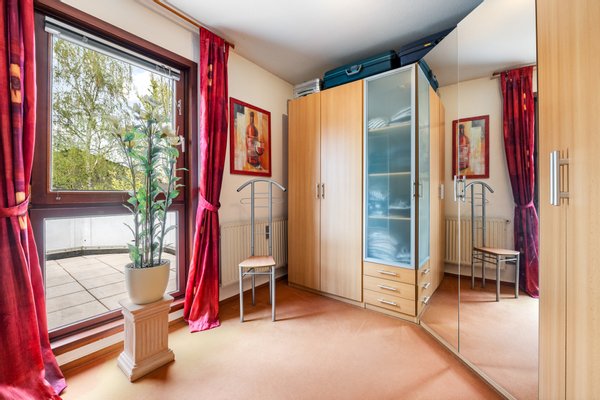 • Schlafzimmer, Teppichboden, mit bodentiefen Fenstern und Zugang zur umlaufenden Dachterrasse