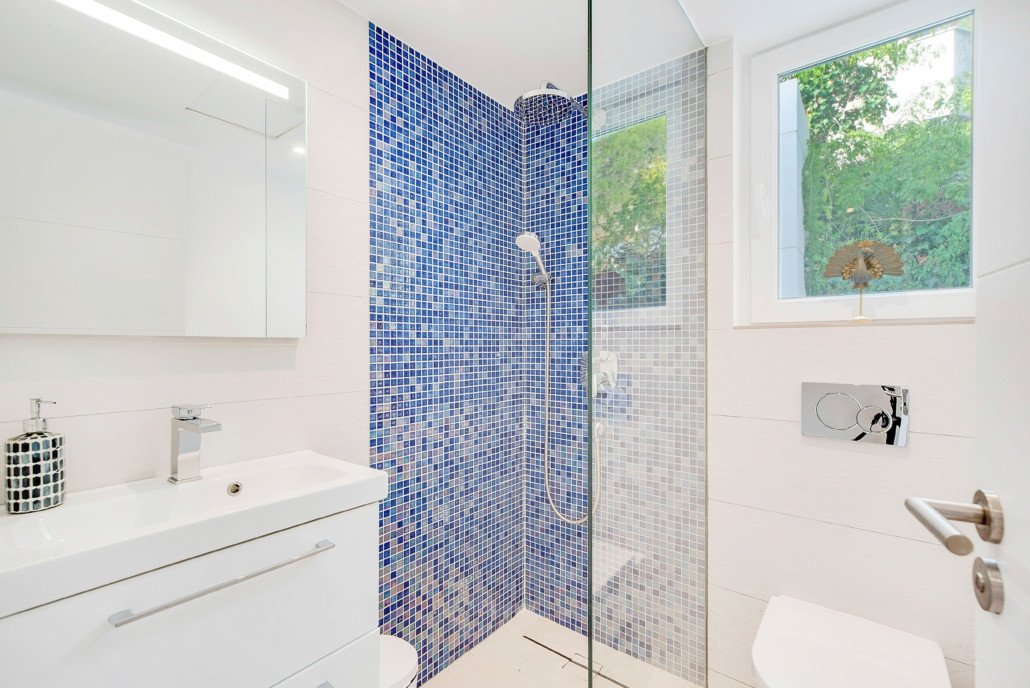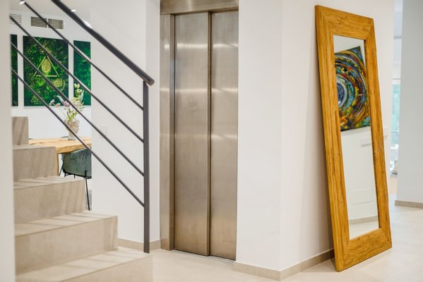 Von dort aus besteht die Möglichkeit, über eine Glastür die Villa zu betreten und hat zur Linken einen noch ausbaufähigen Raum zur Verfügung, der als SPA ausgebaut werden kann. Zur Rechten liegt der direkte Zugang von der Garage ins Haus. Geradeaus durch den Gang findet man die indirekt beleuchtete Treppe oder alternativ den Aufzug, um die erste Etage zu erreichen.