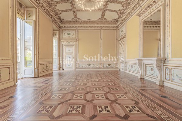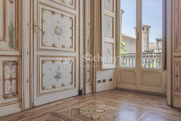 Herzstück der Wohnung ist dieser rund 60 m² große Saal mit Blick auf die Piazza Castello, der originale Wandvertäfelungen (Boiserien), eine mit 24-karätigem Blattgold verzierte Decke sowie ein intarsiertes Parkett aus Kirsch- und Nussbaumholz aus dem 18. Jahrhundert bewahrt.