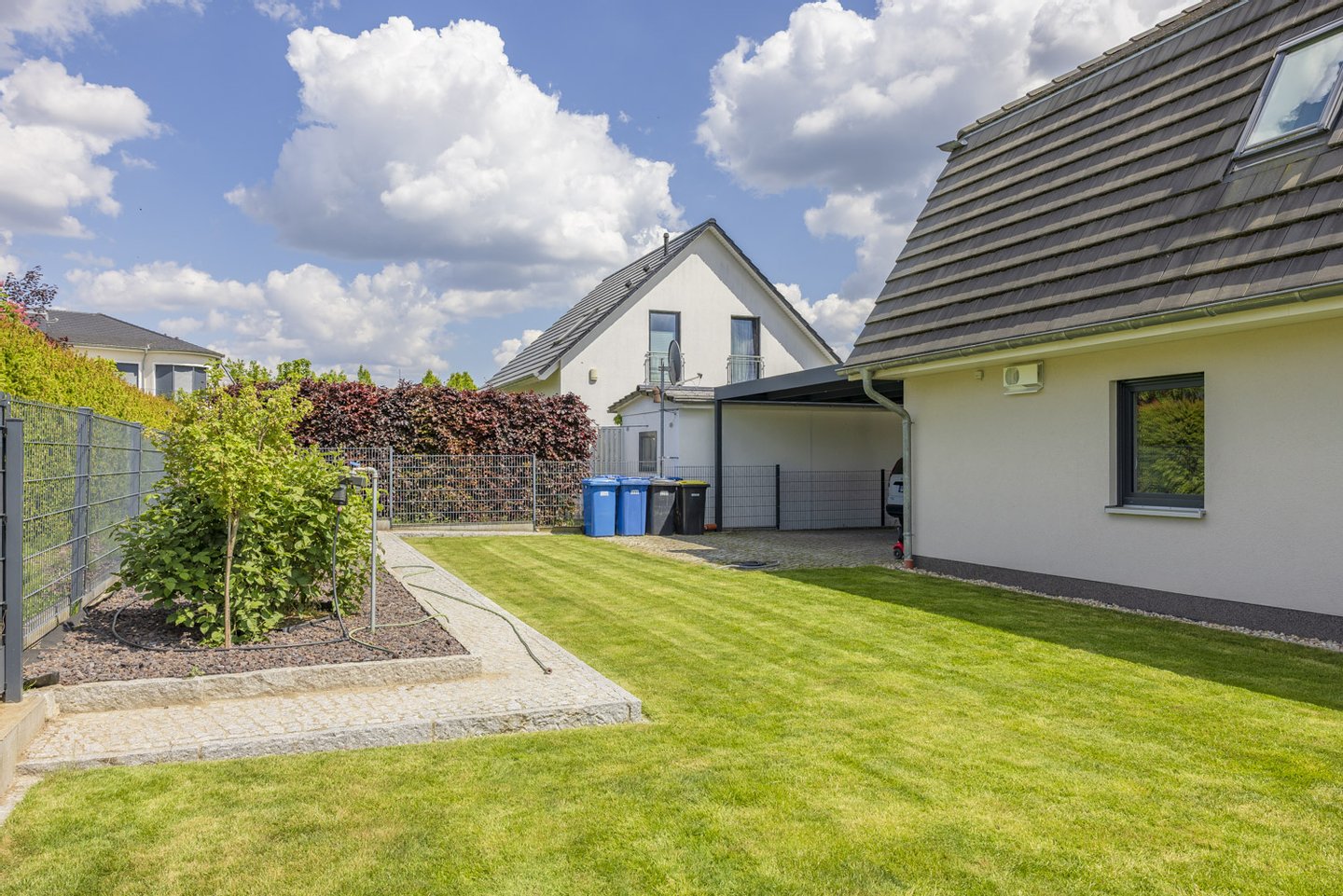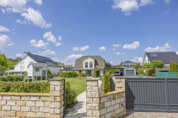 Der großzügige Doppelcarport ist direkt an das Haus angeschlossen, sodass man auch bei schlechtem Wetter geschützt das Auto erreicht. Zudem bietet die lange, gepflasterte Zufahrt ausreichend Parkmöglichkeiten für Familien und Besucher. Das elektrische Zufahrtstor bietet zusätzlichen Komfort und Sicherheit.