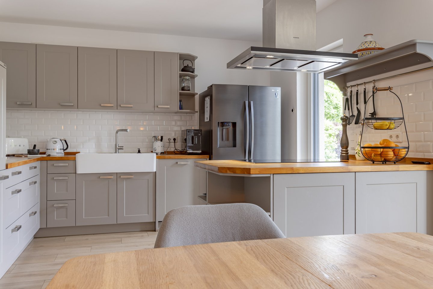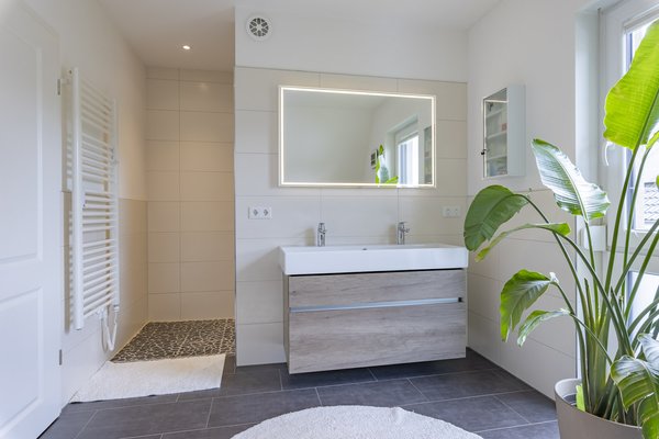 Das Erdgeschoss und das Obergeschoss verfügen über eine Fußbodenheizung, die durch eine effiziente Erdwärmepumpe (Sole-Bohrung) betrieben wird und zusätzlich mit einer Be- / Entlüftungsanlage kombiniert ist. Diese umweltfreundliche Lösung sorgt für eine angenehme Wärmeverteilung und Frischluftzufuhr im gesamten Haus. Die Haustechnik wird Homatic Smart-Home-Steuerung unterstützt, die eine komfortable Bedienung von Heizung, Beleuchtung und weiteren elektronischen Geräten ermöglicht. Eine LAN-Verkabelung sorgt für eine zuverlässige Internetverbindung im gesamten HausDie Räume sind mit hochwertigen Fliesen- und Vinylböden ausgestattet. Die Einbauküche bietet ausreichend Arbeitsfläche und Stauraum.