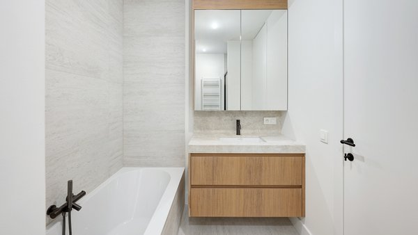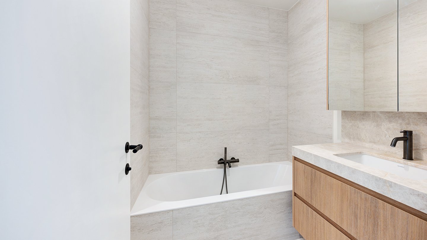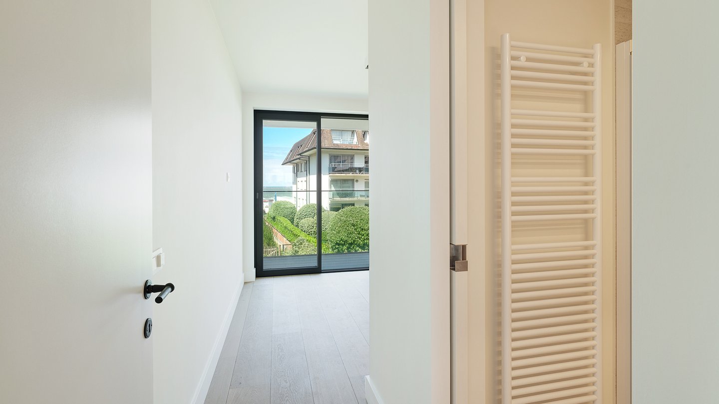 Auf der ruhigen Rückseite befinden sich zwei große Schlafzimmer mit Einbauschränken. Das Hauptschlafzimmer verfügt über ein eigenes Bad mit Badewanne und Dusche. Das zweite Zimmer hat ein separates Duschbad. Beide Zimmer haben Zugang zu einer Terrasse mit Meerblick.