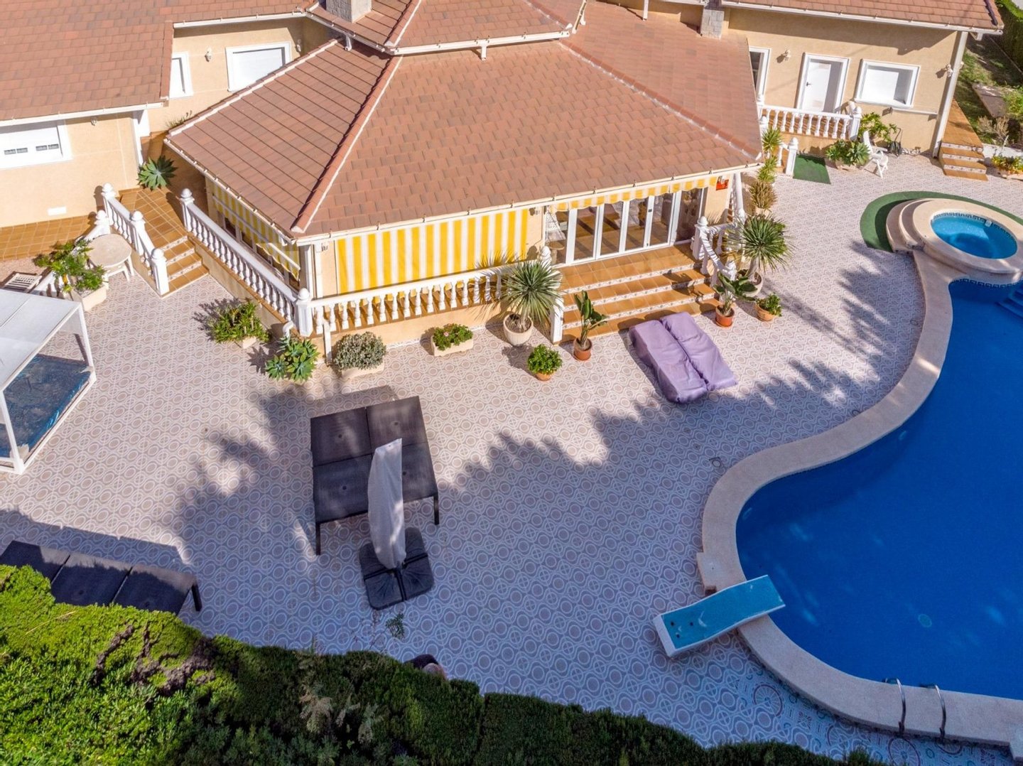 Ein Highlight des Anwesens ist der große private Garten und die zahlreichen Terrassenbereiche rund um die Residenz. Zu den Außenanlagen gehören ein Grillplatz, eine Pergola zum Essen im Freien, eine Garage und ein großzügiger privater Swimmingpool.